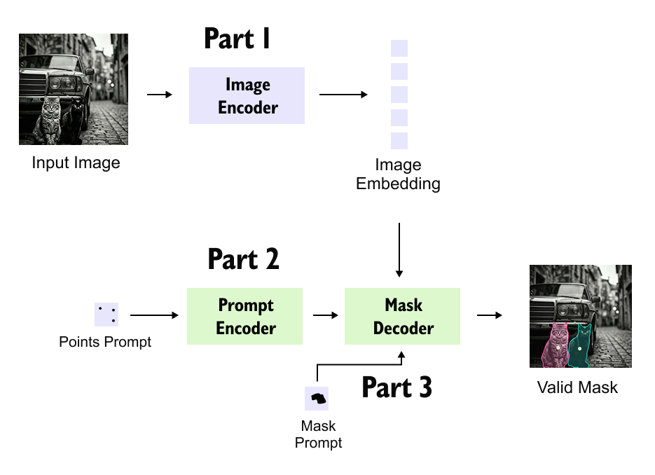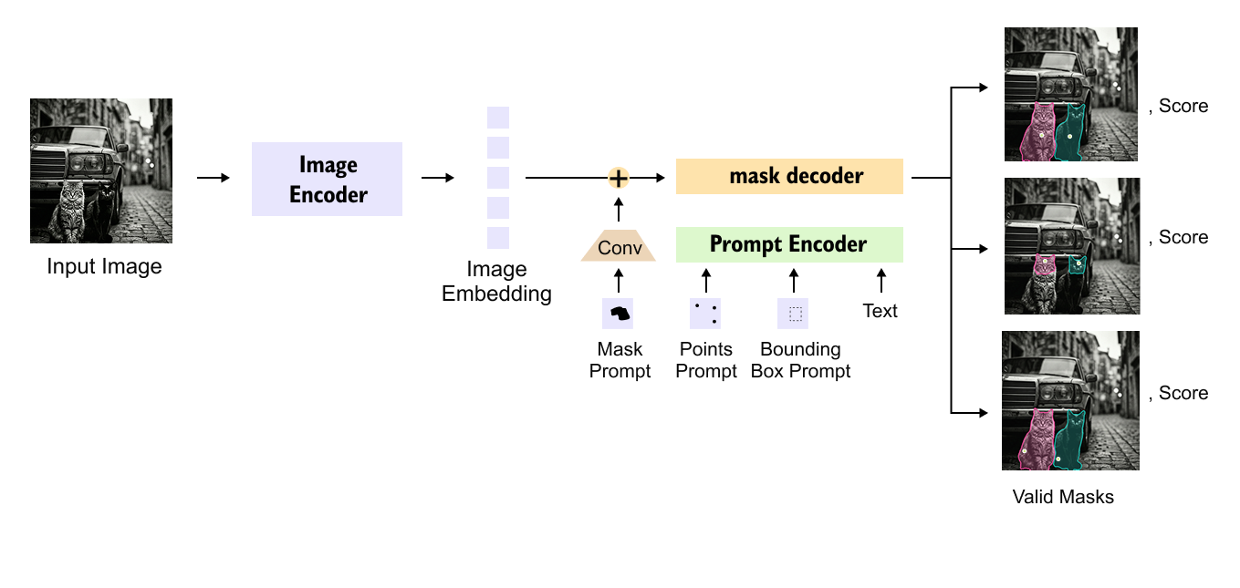 Figure 1.11: Bird’s-eye view of the Segment Anything Model architecture. The image encoder extracts visual embeddings, the prompt encoder encodes user guidance, and the mask decoder combines both to generate valid segmentation masks.
