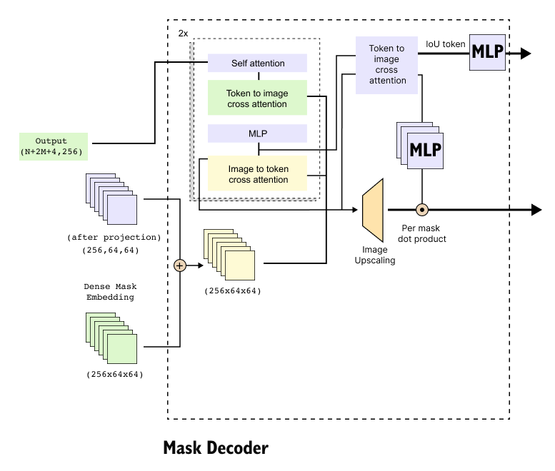 The mask decoder is the only component in SAM that performs full transformer-based reasoning. Its role is to combine visual information from the image encoder with prompt-derived tokens and transform them into final segmentation masks along with corresponding IoU confidence scores. Architecturally, the decoder operates on two parallel inputs: a token sequence and a spatial image feature map, each carrying complementary information.
