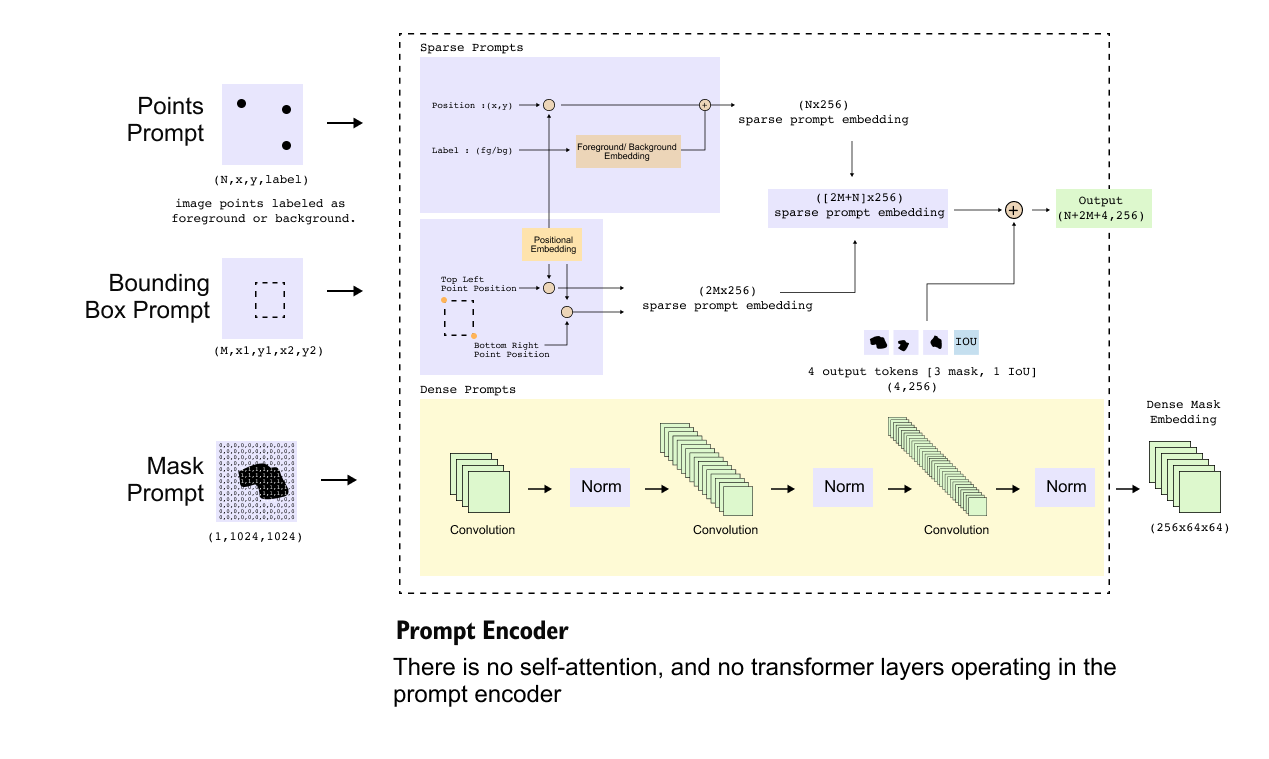In parallel, SAM processes the user-provided prompt through a dedicated prompt encoder. Prompts can take different forms, such as points, bounding boxes, or coarse masks, but regardless of their modality, they must be mapped into a common embedding space. The role of the prompt encoder is precisely this: to transform heterogeneous prompt signals into prompt embeddings that are compatible with the image embedding. These embeddings do not directly encode semantic class labels; instead, they encode intent, that is, what region or object the user is interested in segmenting.