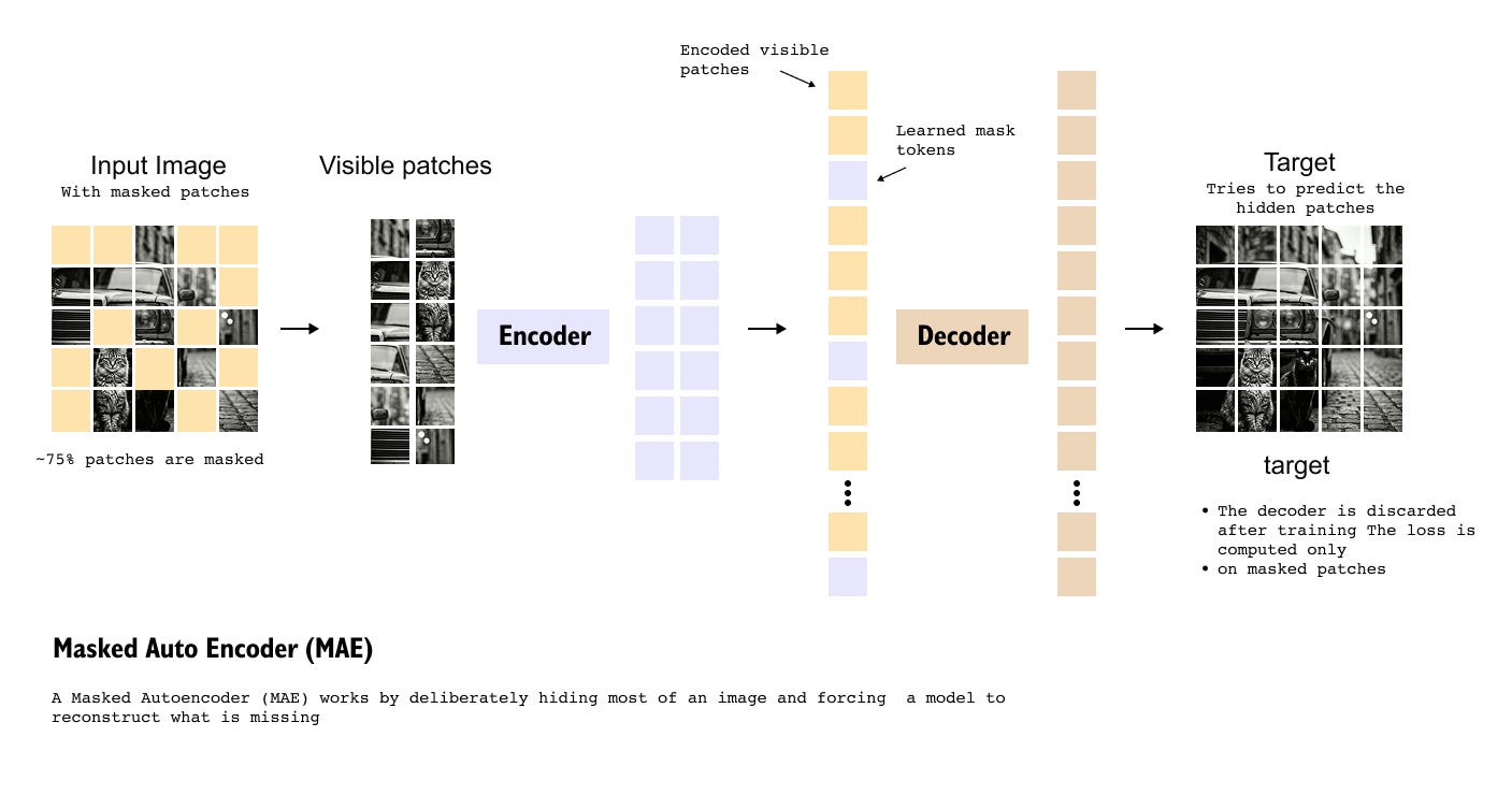 This idea is directly analogous to masked language modeling in models such as BERT, where words are hidden and the model learns to predict them from surrounding context. In MAE, however, the basic units are image patches instead of words.