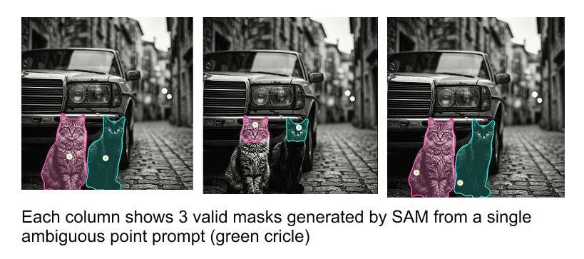 A key design choice in SAM is that the mask decoder produces multiple candidate masks in a single forward pass. This is not an incidental detail, but a deliberate response to the inherent ambiguity of prompts. For example, a single click on an image might correspond to an entire object, a part of that object, or a smaller sub-region. By generating multiple masks along with confidence scores, SAM allows downstream systems, or human users, to select the most appropriate interpretation without requiring repeated inference.