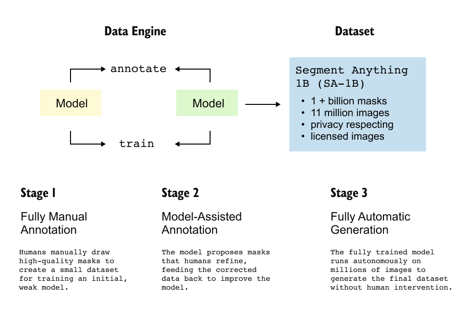 Figure 1.5: Three-stage data engine used to construct the Segment Anything 1B (SA-1B) dataset. The process transitions from fully manual annotation to model-assisted refinement and finally to fully automatic mask generation, producing over one billion segmentation masks at scale.