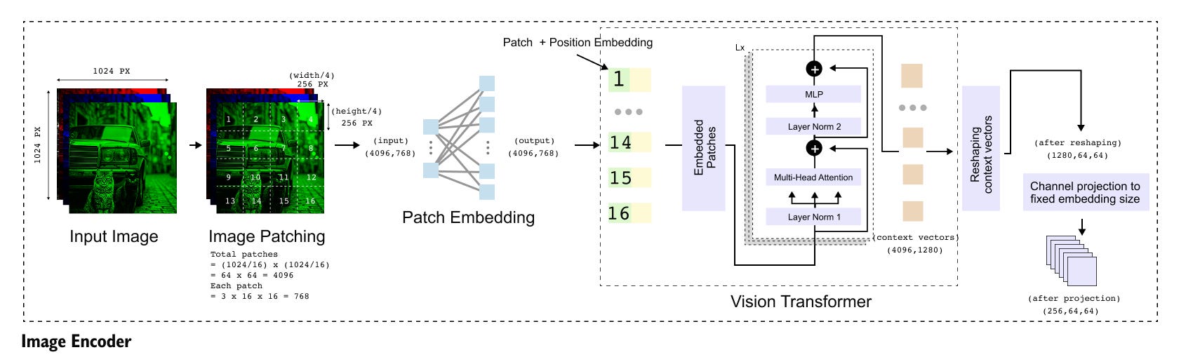 Figure 1.6: Detailed architecture of the SAM image encoder. A high-resolution input image is divided into 16 × 16 patches, projected into a 1280-dimensional embedding space, processed by a Vision Transformer, reshaped into a 64 × 64 spatial grid, and finally projected to a 256-channel feature map used by the mask decoder.