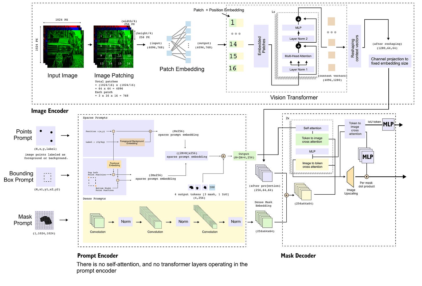 From an architectural perspective, the division of labor within SAM is both clear and principled. The image encoder is dedicated to visual understanding, transforming the raw input image into a rich representation that captures spatial structure and semantic content. The prompt encoder focuses on modeling user intent, converting different forms of prompts such as points, boxes, or masks into embeddings that guide the segmentation process. The mask decoder then performs multimodal reasoning by jointly attending to the image embeddings, prompt embeddings, and learnable mask tokens in order to generate accurate segmentation outputs. This modular design not only improves interpretability by clearly separating concerns within the model, but also makes SAM highly extensible. Individual components can be independently replaced, scaled, or integrated with external systems such as vision language models without modifying the core segmentation framework.