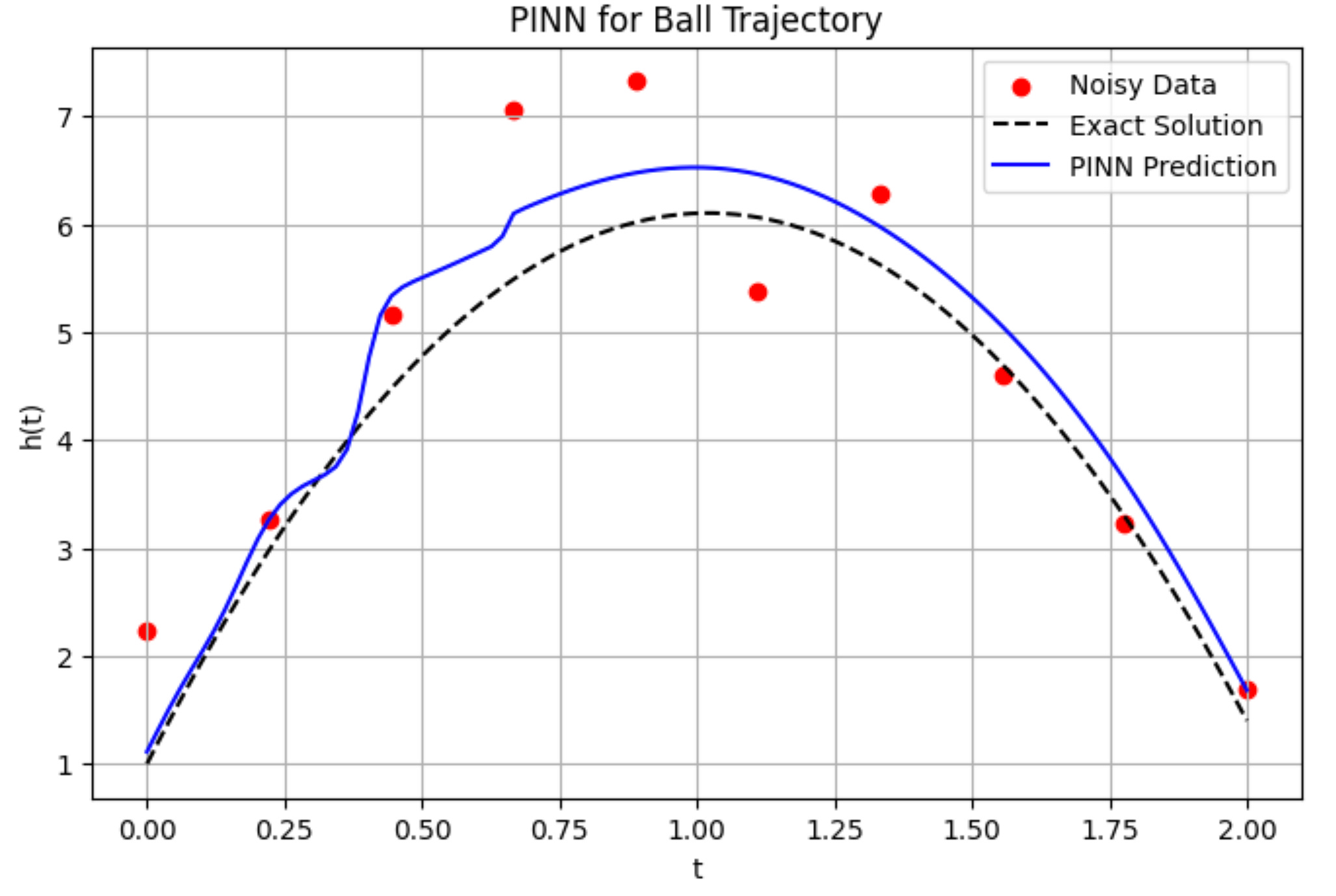 If you are pretty sure about the physics the you can set λ1 to zero. In the ball throwing experiment, you will be sure about the physics described by our ODE if air drag, wind, buoyancy and any other factors are ignored. Only gravity is present. And in such cases, the PINN effectively becomes an ODE solver.