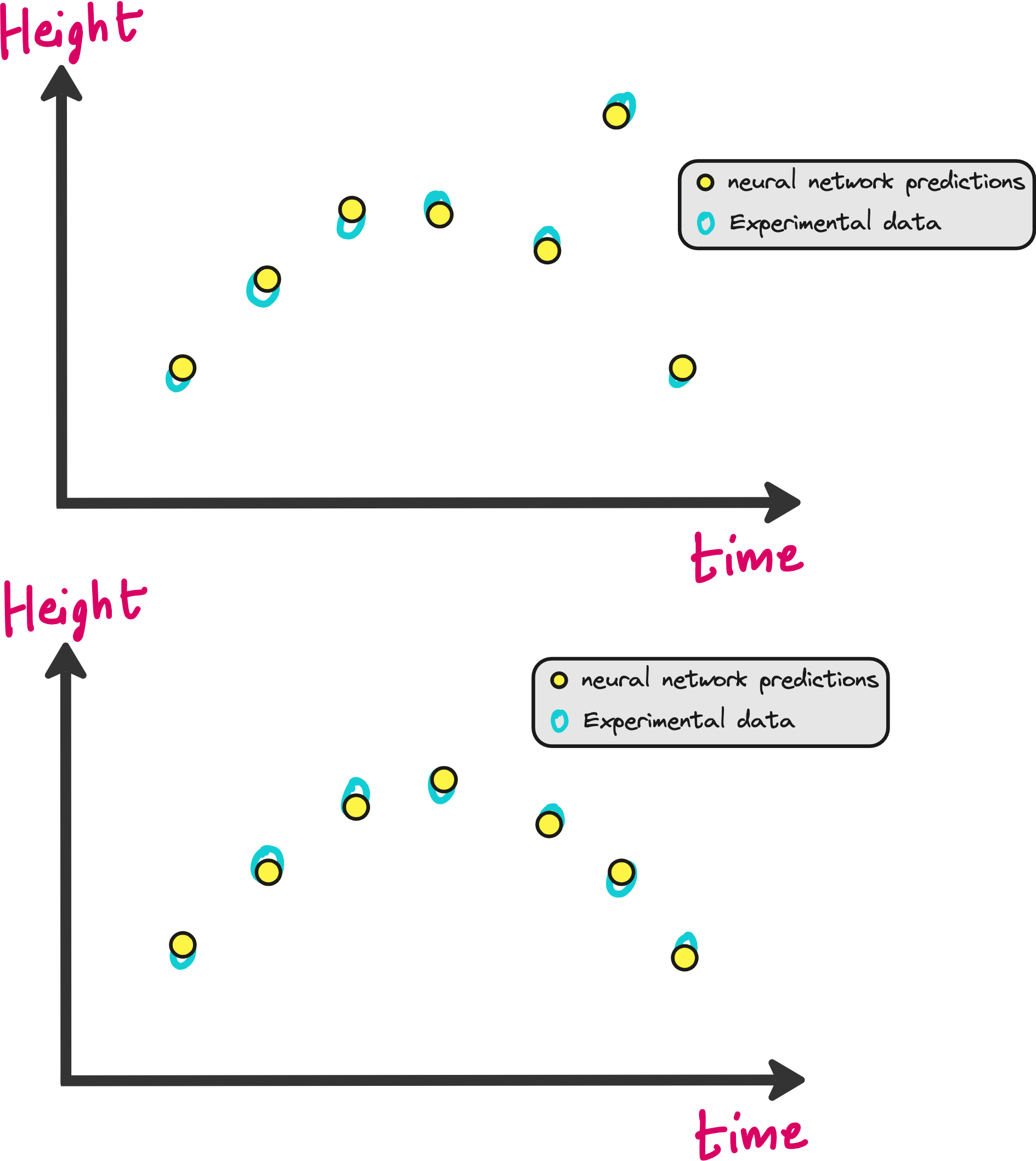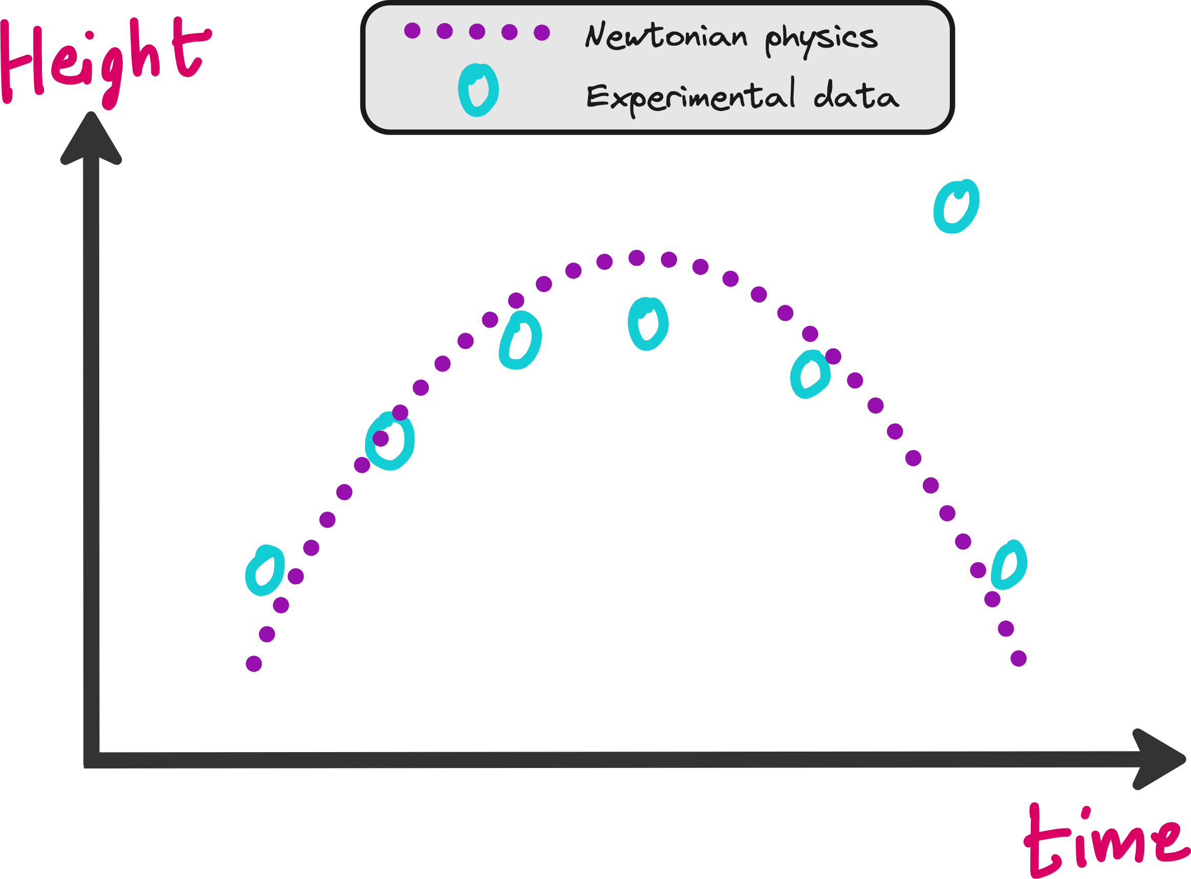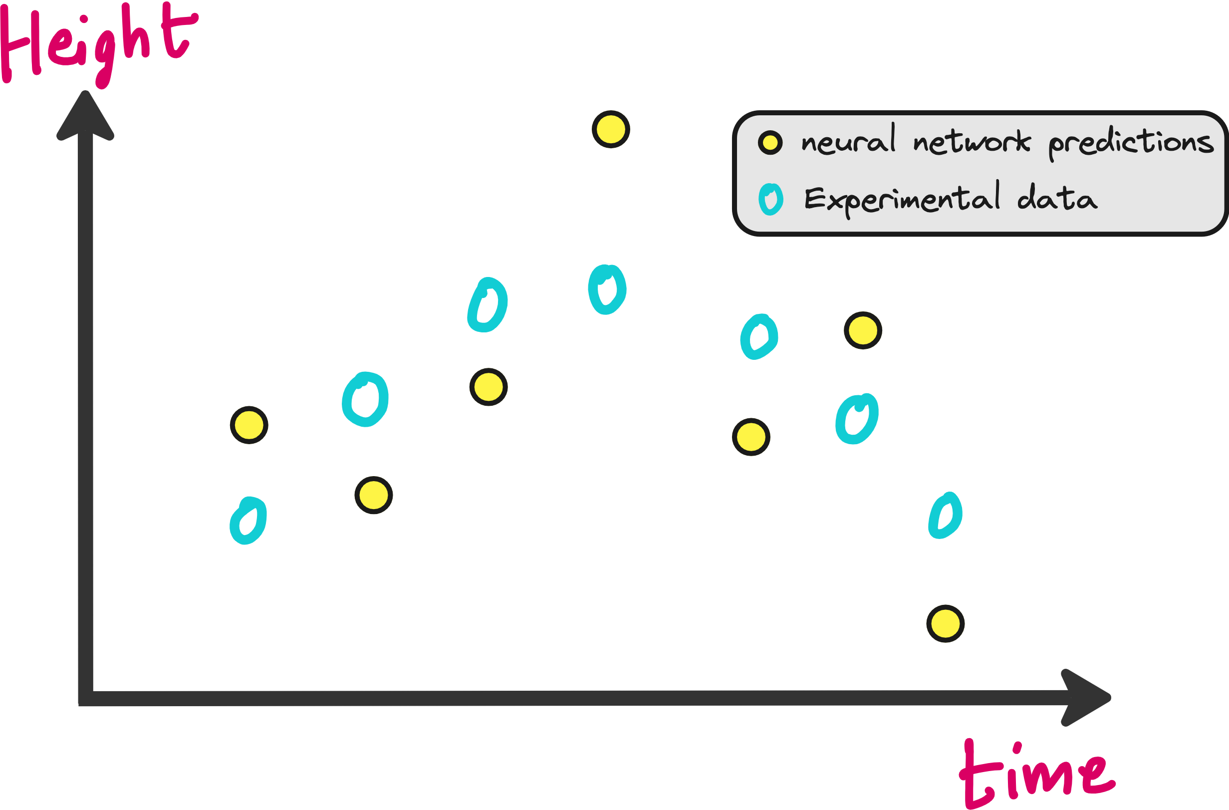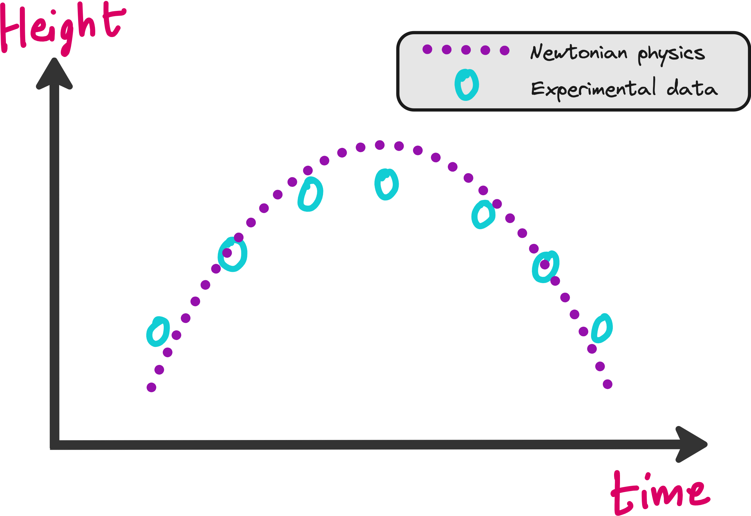 It is easy to train a neural network on this dataset so that you can predict the height of the ball even at time points where you did not note down the height in your experiments.