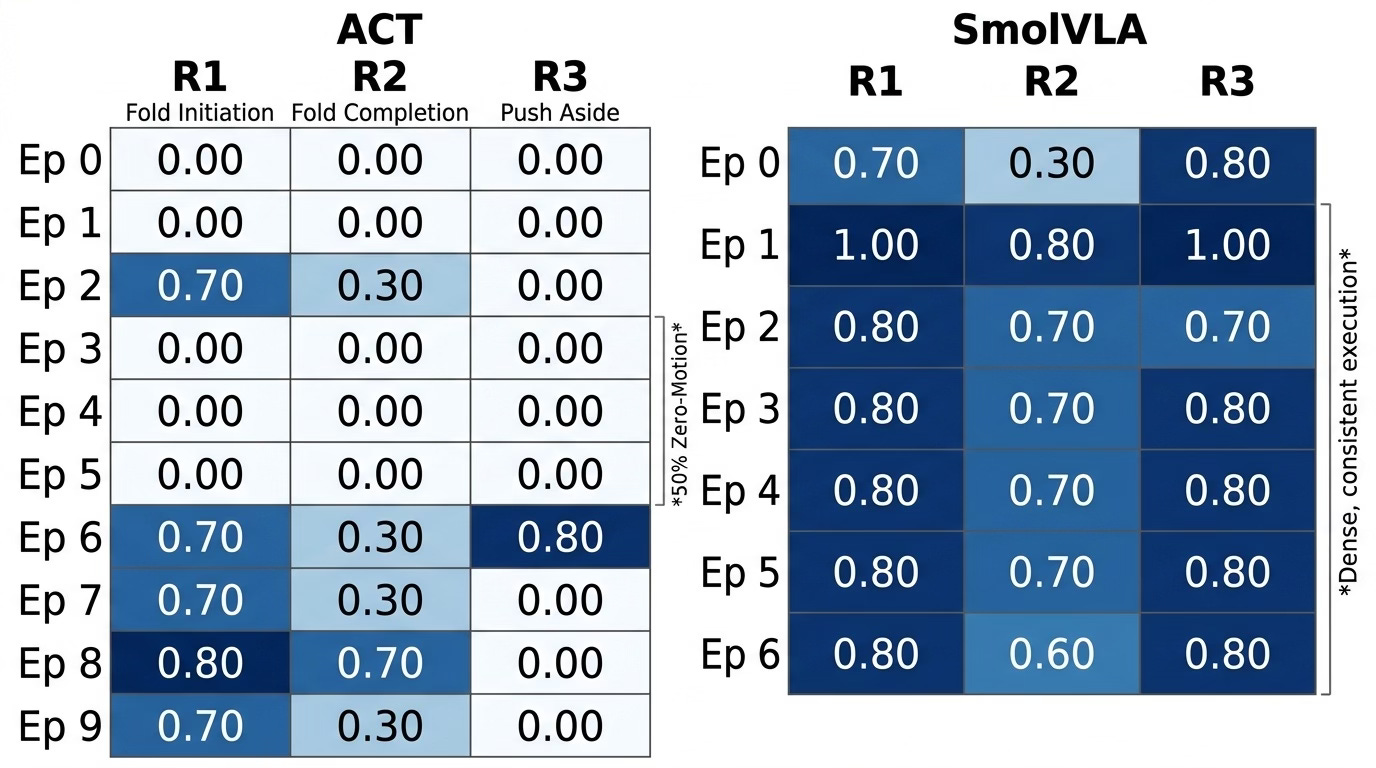 Per-episode performance heatmap. Left: ACT shows sparse activation — 50% of episodes had zero motion (white rows). Right: SmolVLA shows dense, consistent high scores across all episodes. The contrast visually captures SmolVLA’s reliability vs ACT’s bimodal behavior.