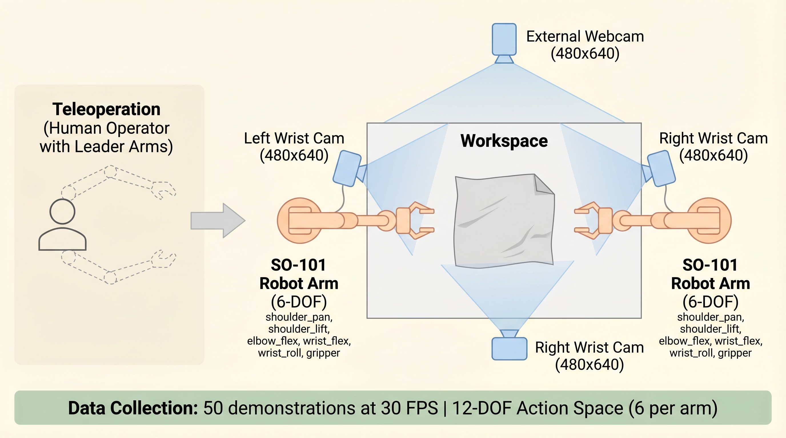 I collected 50 teleoperation demonstrations of myself folding a cloth, totaling ~48,000 synchronized frames stored in LeRobot v3.0 format. Each demonstration captures the full pipeline: reach for the cloth edge, fold it over, press down, push it aside.