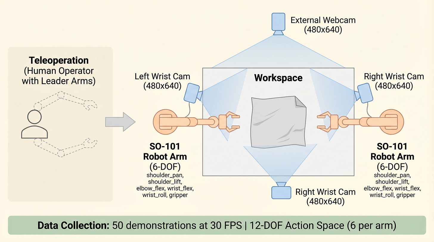 - Three cameras— left wrist, right wrist, and an overhead webcam (all 480x640, synced at 30 FPS)
