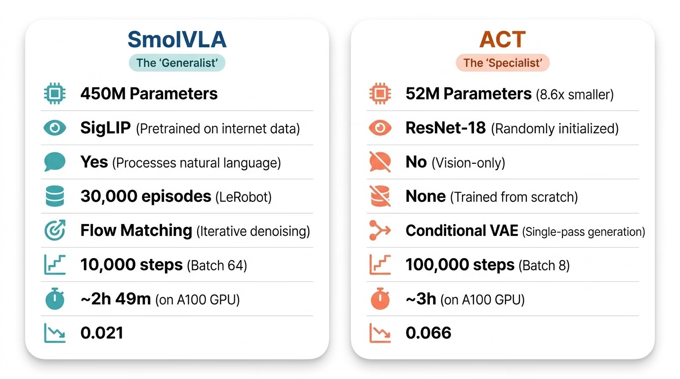 SmolVLA: the “Generalist adapted to a specialty” — 450M parameters, pretrained on 30K episodes, language-conditioned, flow matching. ACT: the “Specialist” — 52M parameters, trained from scratch, vision-only, Conditional VAE.