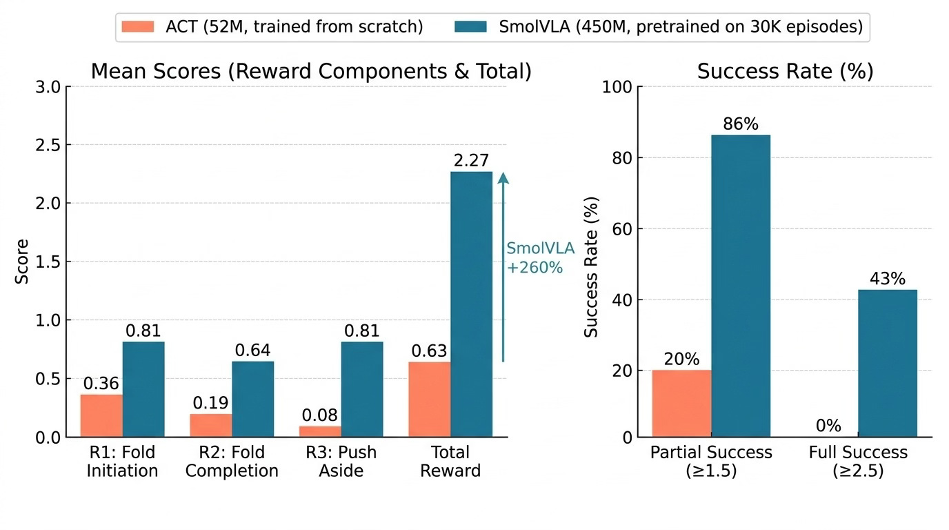 Head-to-head comparison: SmolVLA scores 2.27/3.0 mean total reward vs ACT’s 0.63/3.0 — a 260% improvement. SmolVLA achieves 86% partial success rate vs ACT’s 20%.