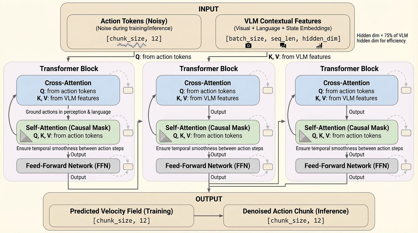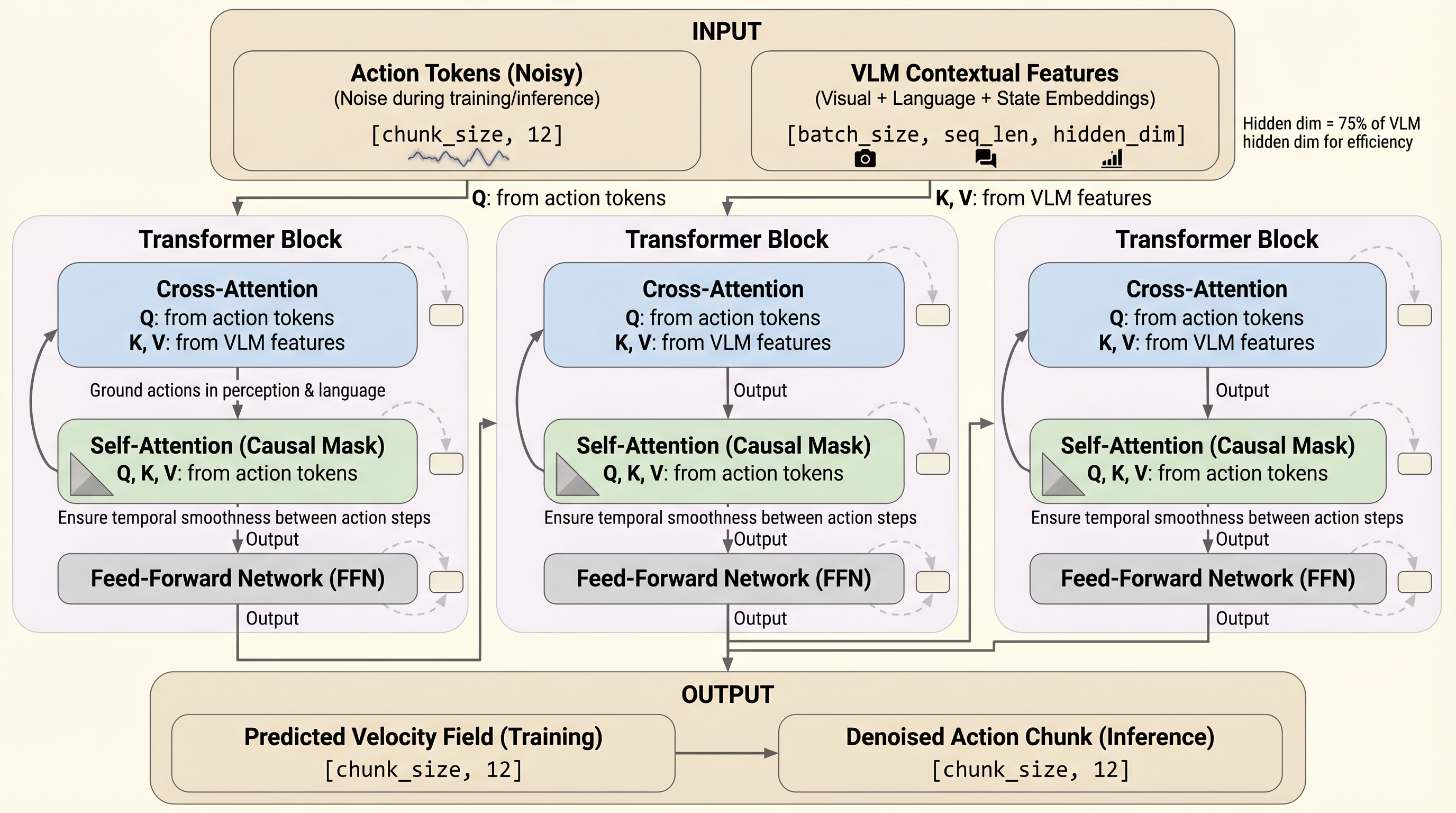 The action expert uses interleaved cross-attention (grounding in visual context) and self-attention (temporal coherence across the action chunk).