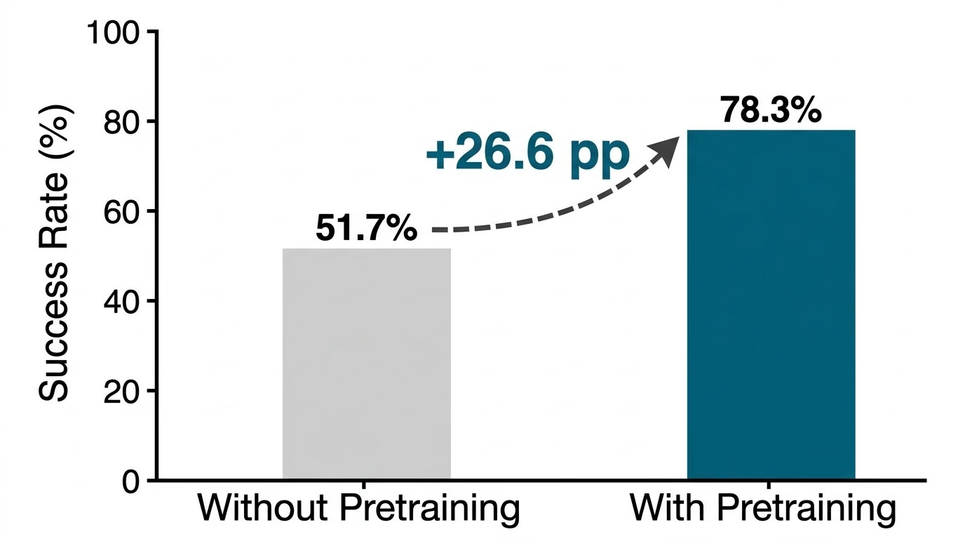 Without pretraining: 51.7% success. With pretraining: 78.3% success. A +26.6% absolute improvement from pretraining alone.