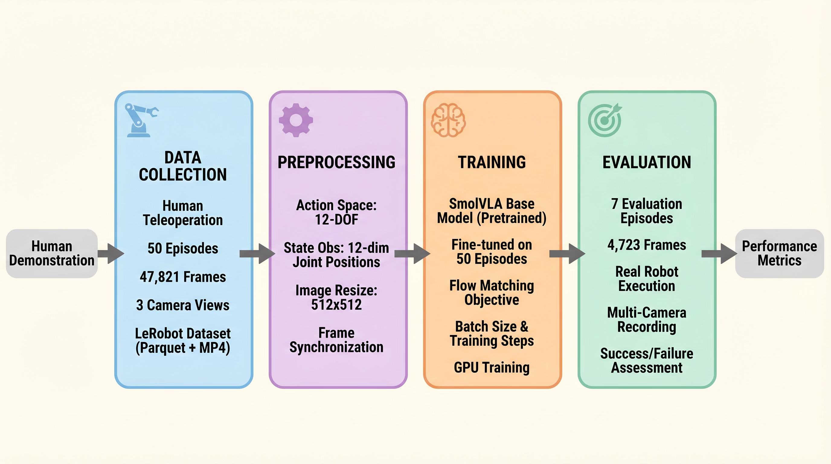 5. The LeRobot ecosystem is a force multiplier. Standardized data formats, community pretrained models, and plug-and-play training scripts dramatically reduce the engineering burden. This entire project — data collection, training, evaluation — was done by one person.