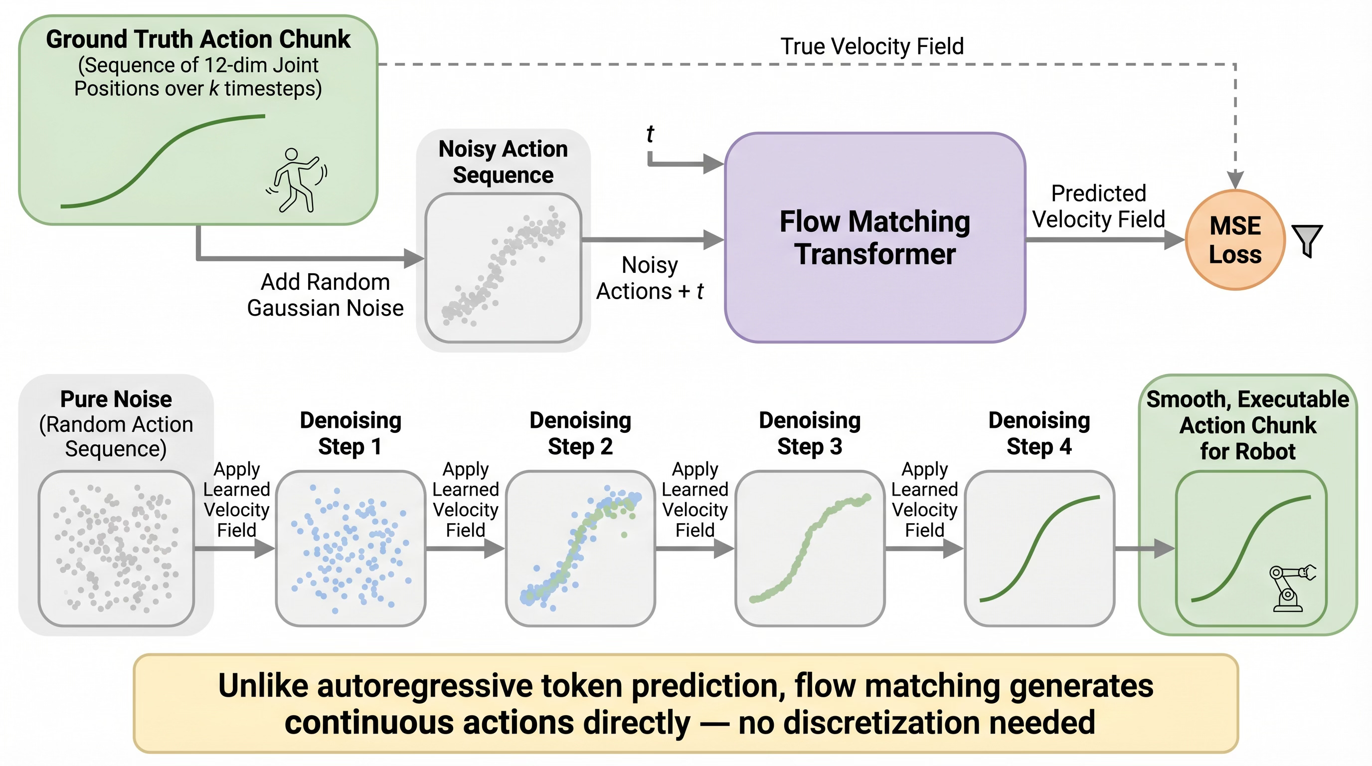 Think of flow matching like this: during training, you take a real trajectory and add noise to it. The model learns to predict the “velocity field” — the direction to push each noisy point to recover the clean trajectory. At inference, you start from pure noise and iteratively apply the learned velocity field to generate a smooth, coherent action sequence.