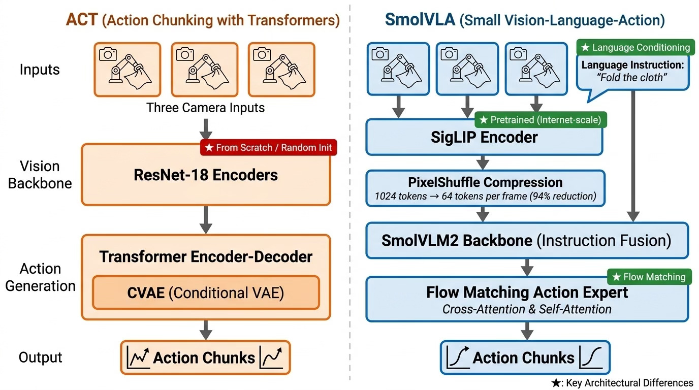 Architectural comparison: ACT’s simpler pipeline (ResNet-18 + CVAE) vs SmolVLA’s richer pipeline (SigLIP + VLM backbone + Flow Matching action expert). Key differences highlighted: pretrained vs from-scratch vision, language conditioning, and flow matching vs CVAE.