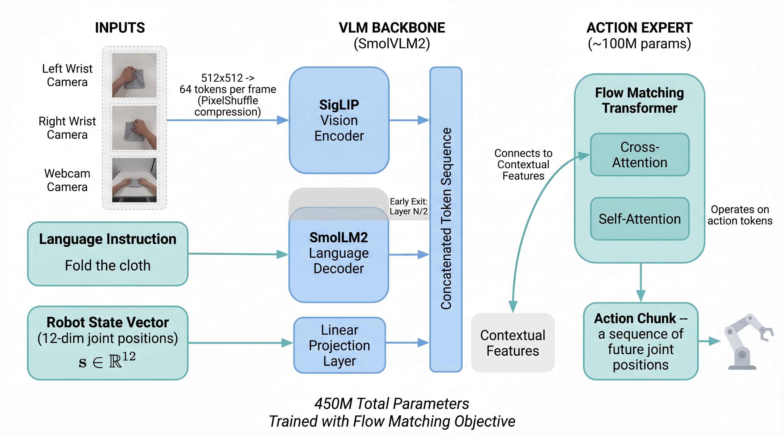 The instruction “Fold the cloth” gets tokenized and processed alongside the visual tokens through a SmolVLM2 language backbone. In a single-task setting like ours, this might seem unnecessary — but it means the same model architecture could handle “Fold the cloth in half” vs. “Roll the cloth up” without retraining the vision pipeline.