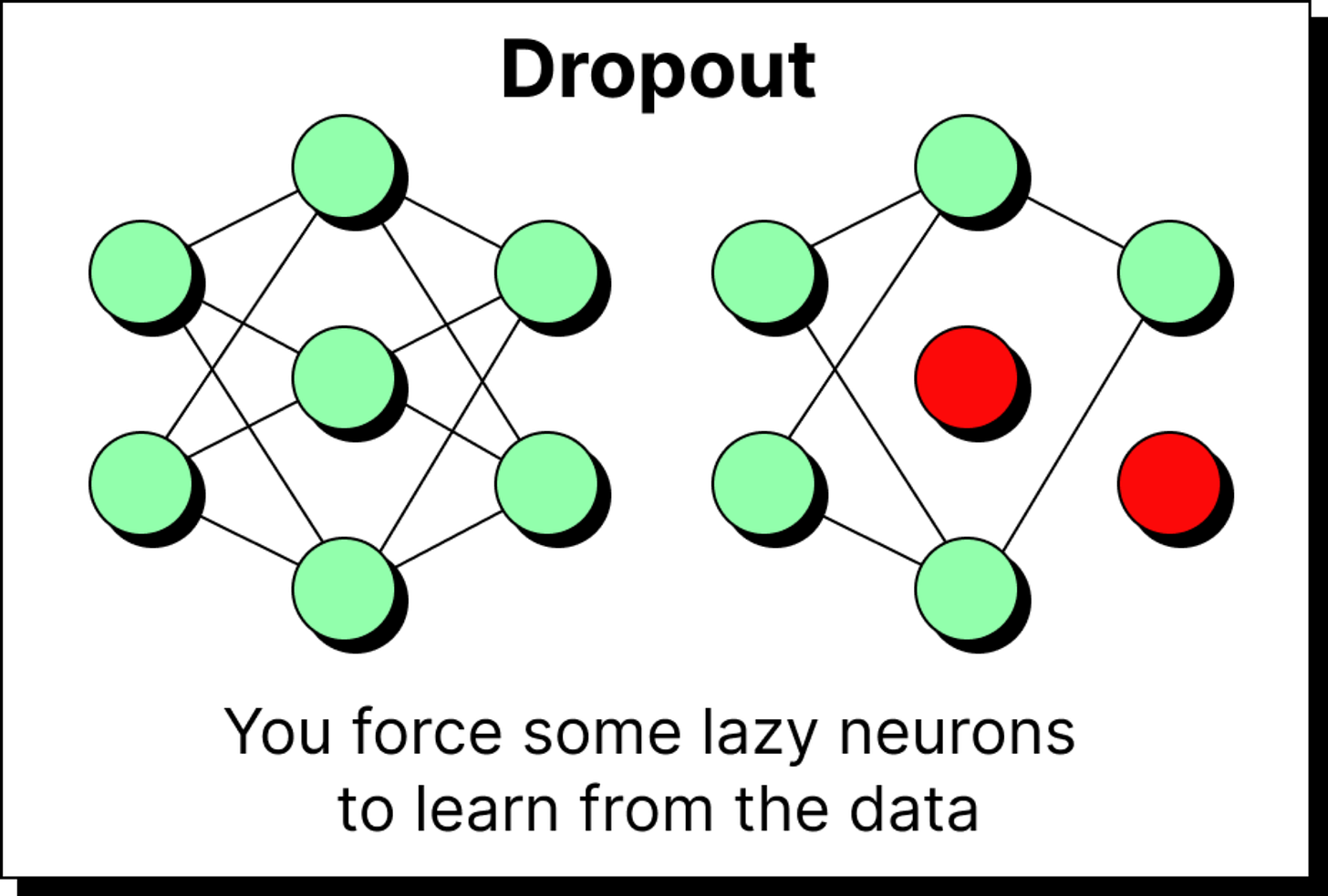 If 20 percent of neurons are dropped in a layer, only the remaining 80 percent are active. To avoid shrinking the overall output, the activations of the remaining neurons are scaled up proportionally. This way, the network’s signal remains balanced, but every neuron is compelled to contribute. Dropout does not introduce new parameters, but it plays a critical role in preventing overfitting and encouraging robustness.