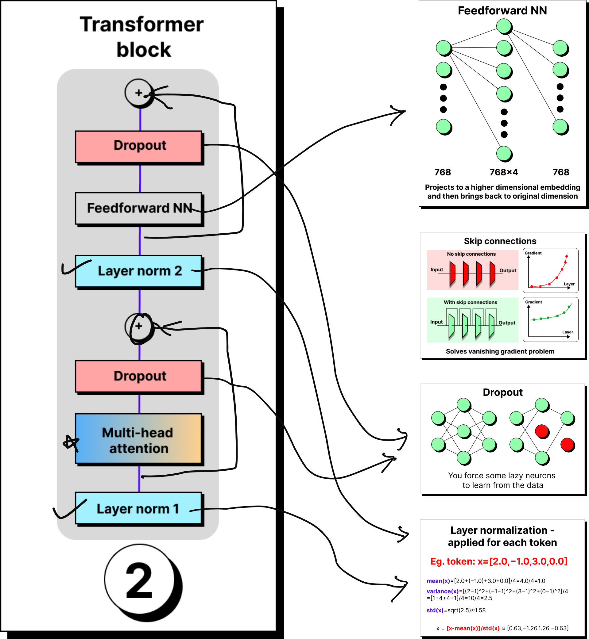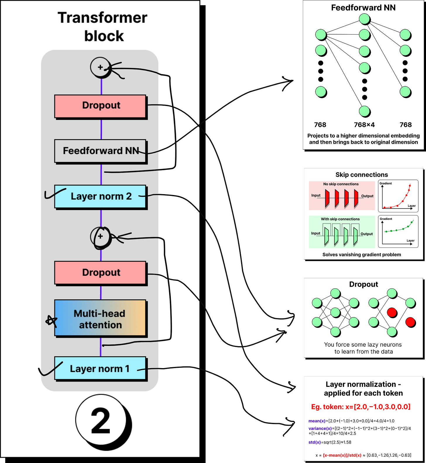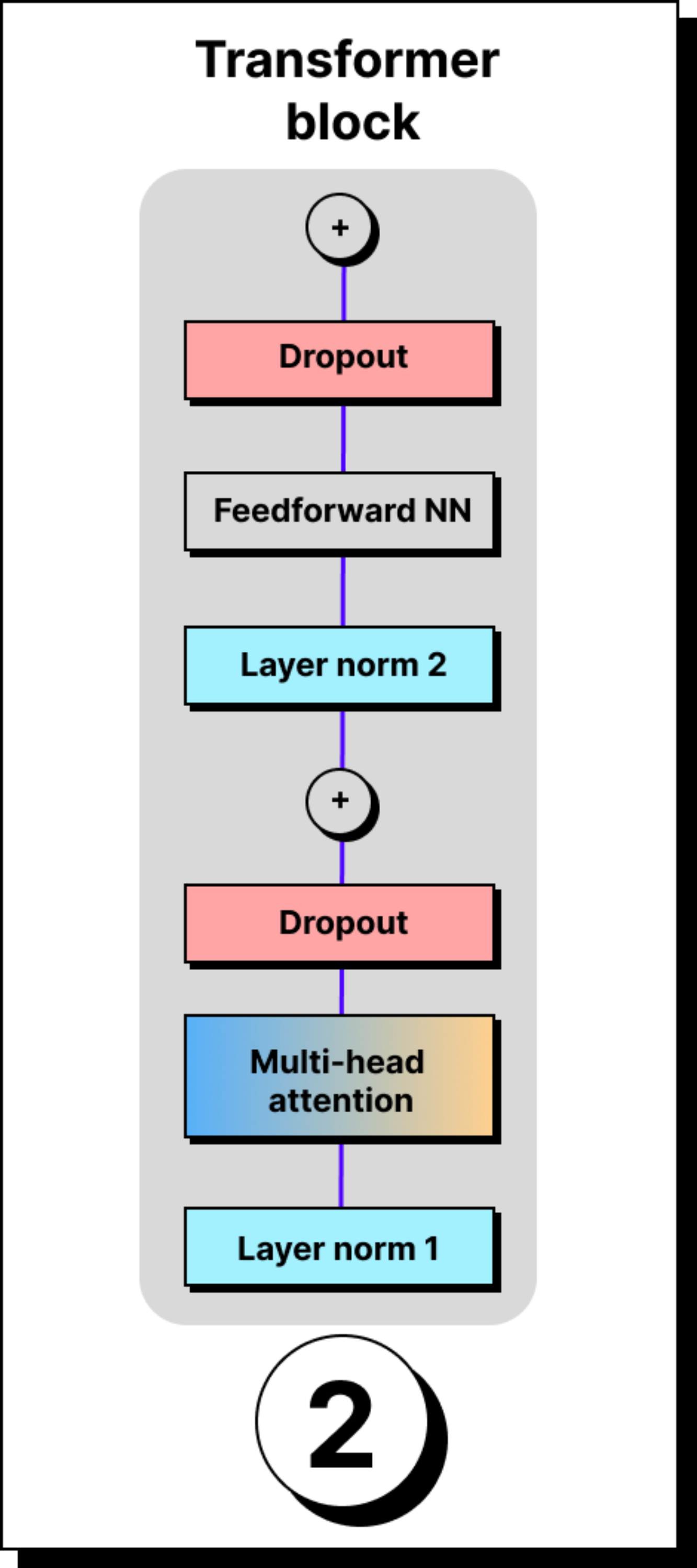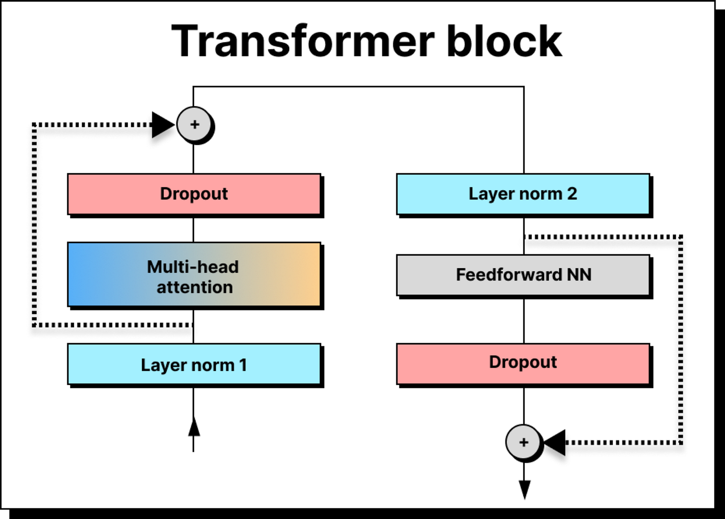 Once tokens are embedded and positionally enriched, they enter the transformer block. A transformer is not just one block, but a stack of many identical ones – 12 in GPT-2, 96 in GPT-3 – arranged in series. Each block refines the token representation further, passing it through the same set of components: layer normalization, multi-head attention, dropout, skip connections, and feed-forward networks.