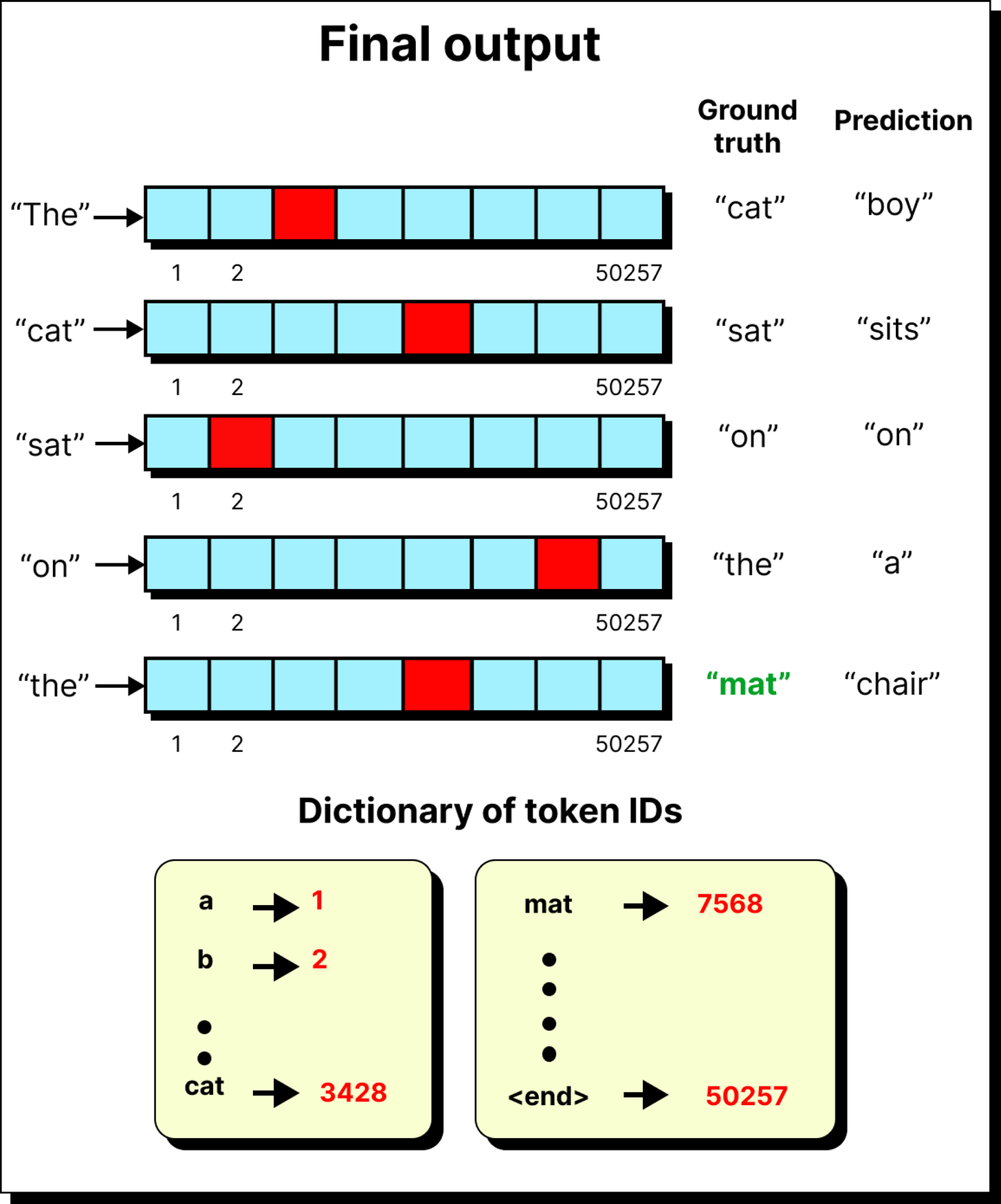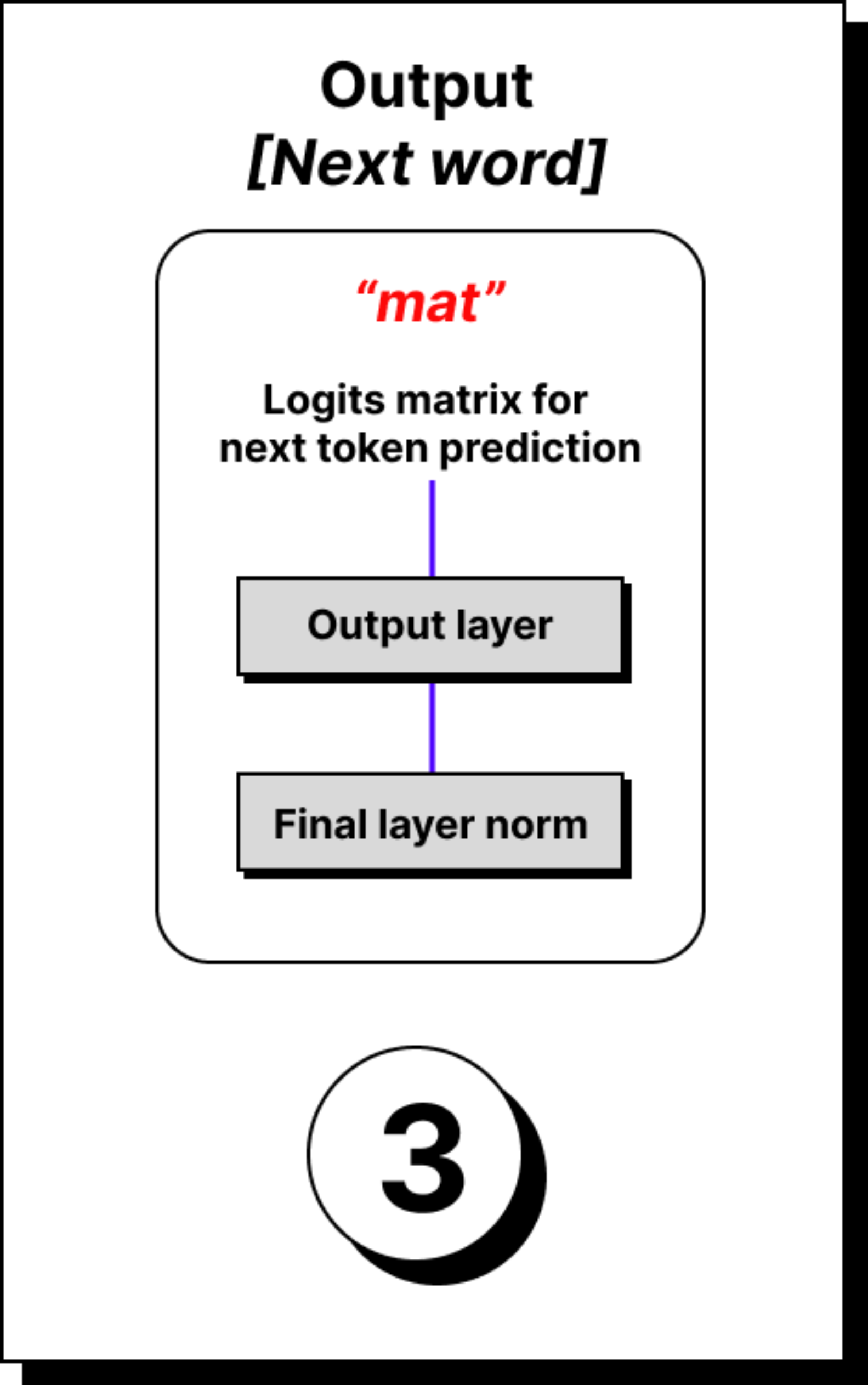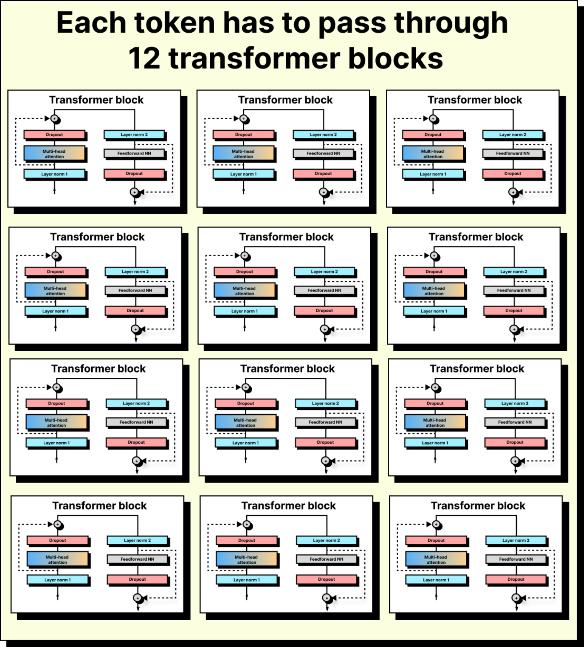 The process described so far – normalization, attention, dropout, skip connections, and feed-forward projection – is repeated across many transformer blocks. In GPT-2, this sequence is repeated 12 times; in GPT-3, 96 times. Each repetition reshapes the token further, embedding it deeper into the context of the sentence. By the end, the original semantic fingerprint of cat is transformed into something almost unrecognizable – a vector that no longer just means “cat,” but “cat in the context of this sentence, after seeing all other tokens around it.”