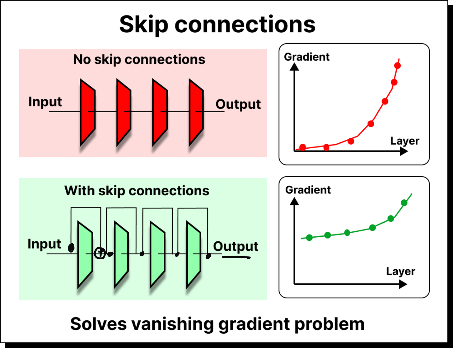 Skip connections, introduced in ResNet, solve this problem by allowing the input of a layer to bypass intermediate operations and be added directly to the output. This simple addition ensures that even if the gradient becomes small in deeper paths, there is still a strong signal flowing back through the shortcut path. Transformers adopted this idea wholeheartedly. Every sub-layer inside a transformer block has residual connections, ensuring that earlier layers remain influential and training remains stable even at great depth.