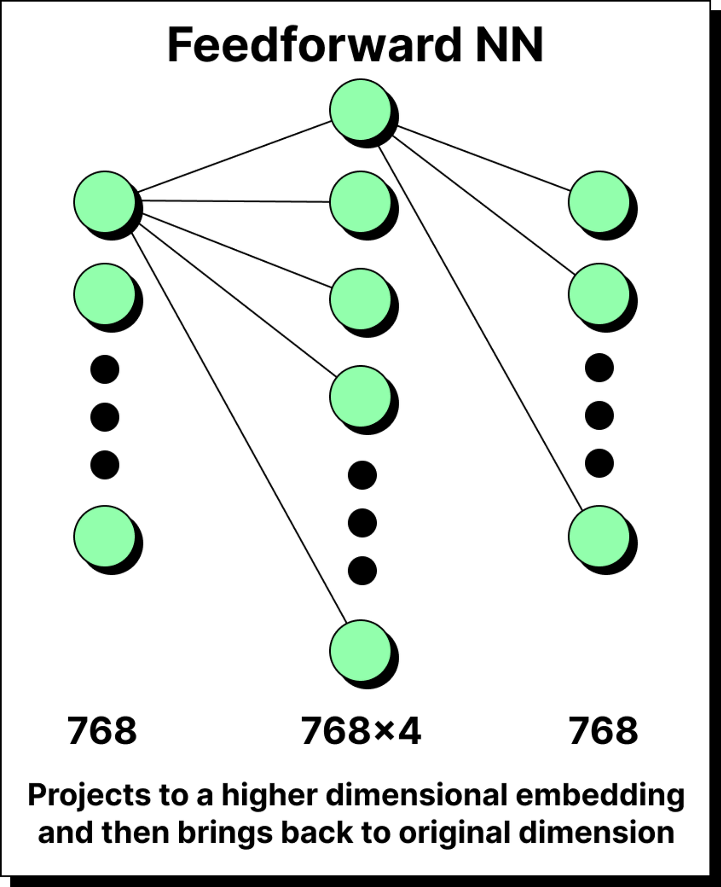 At first glance, this might seem like wasted effort. Why project up only to project back down? The reason lies in feature enrichment. Expanding into a larger space allows the model to capture richer interactions and more abstract features. If we projected downward instead, say from 768 to 300, we would lose information irreversibly. Projection upward enriches the token’s representation, projection downward prunes it back into a usable form, but the new form is more expressive than the original.
