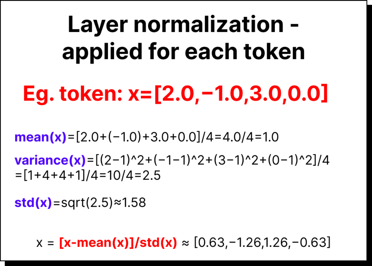 The first operation in the block is layer normalization. Here, the values of the token vector are standardized by subtracting the mean and dividing by the standard deviation. If we stopped here, the mean would always be exactly zero and the variance exactly one, which sometimes over-constrains the representation.