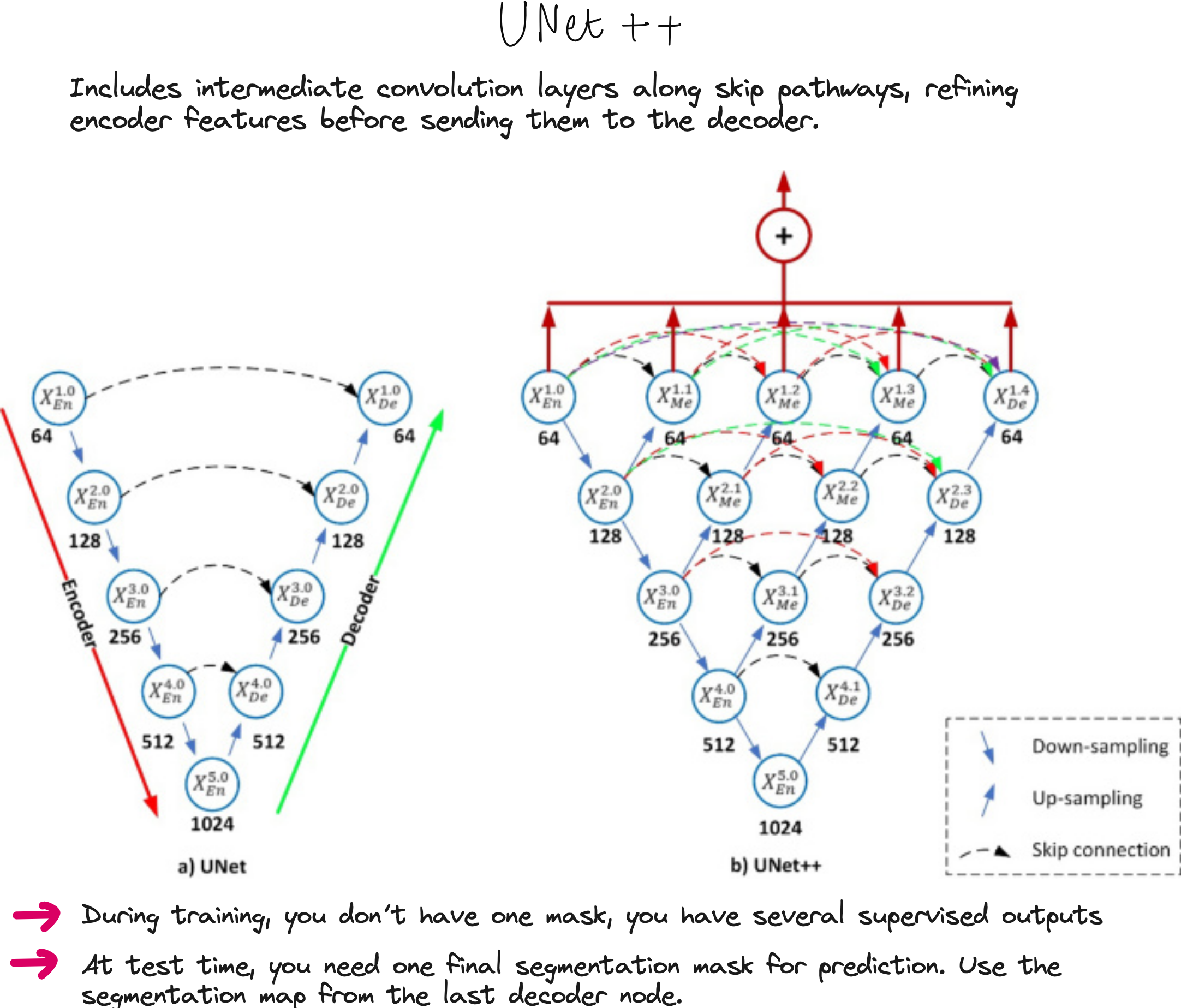UNet++: redesigned skip pathways with intermediate convolution layers for feature refinement.
