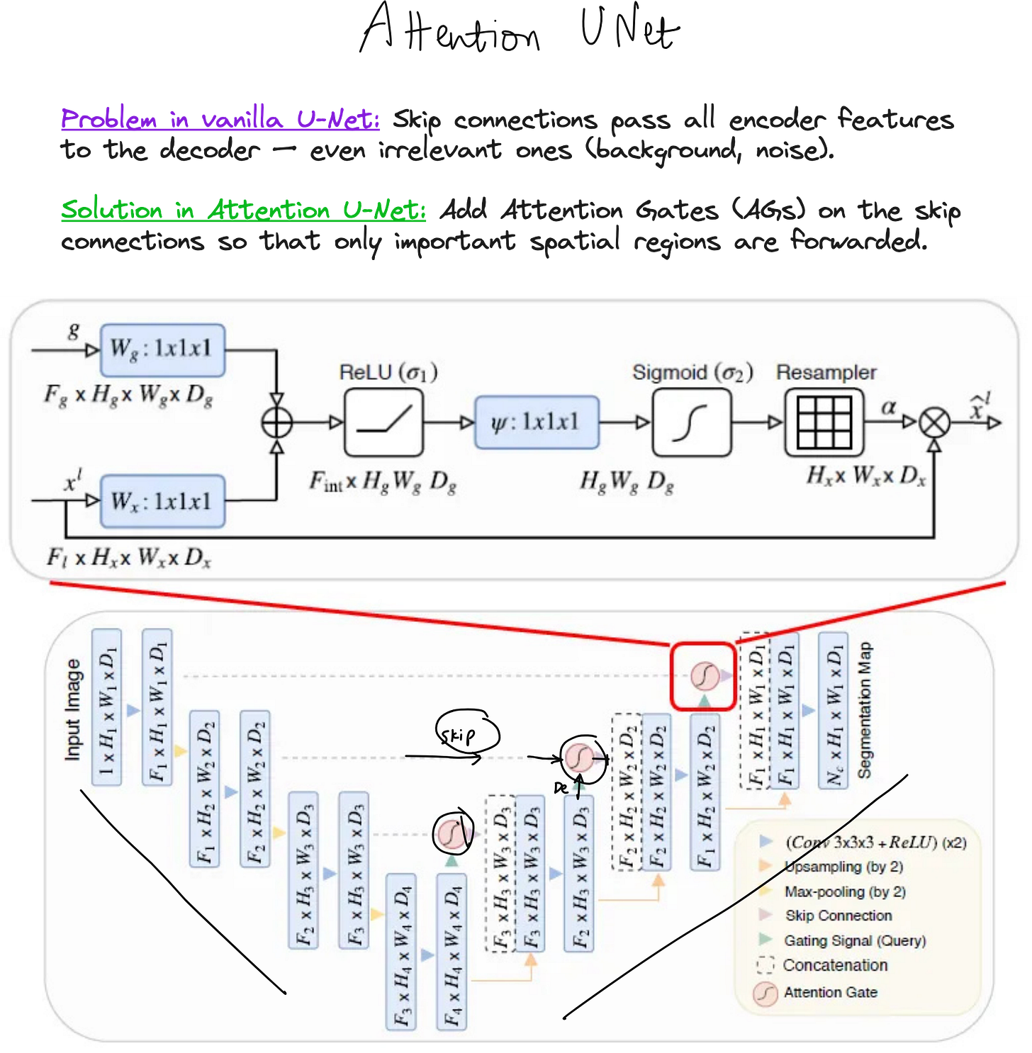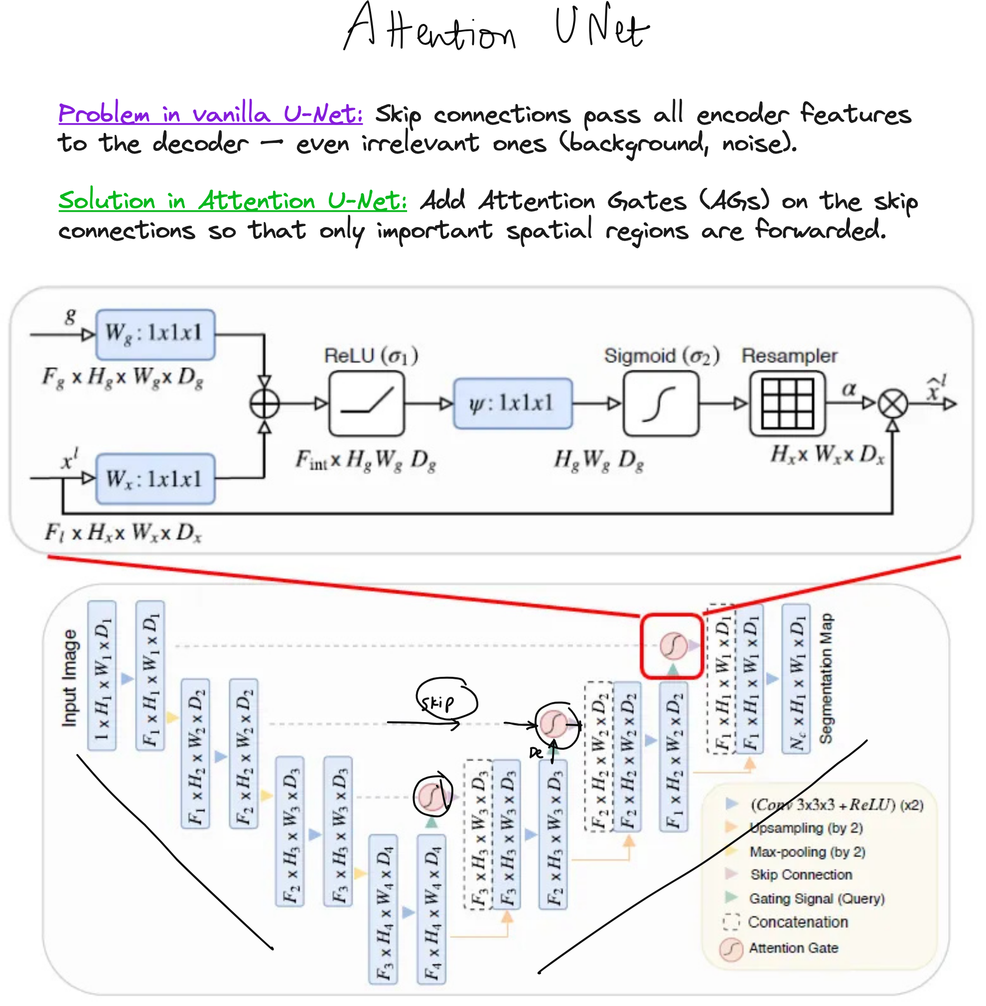 Another powerful idea added to UNet was attention mechanisms. Attention UNet introduced attention gates in the skip connections. Instead of blindly passing all encoder features to the decoder, the network learns to focus on the most relevant features for segmentation.