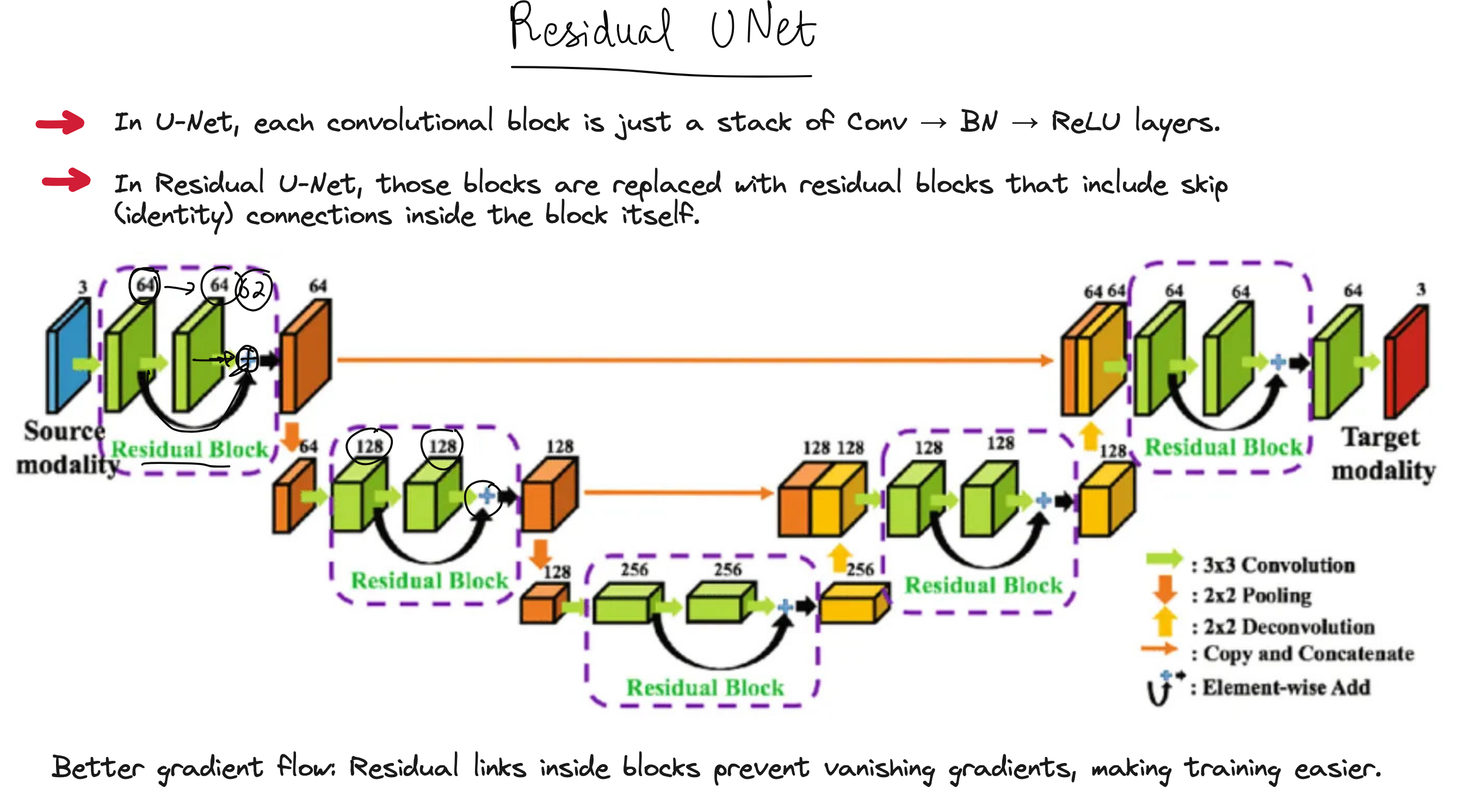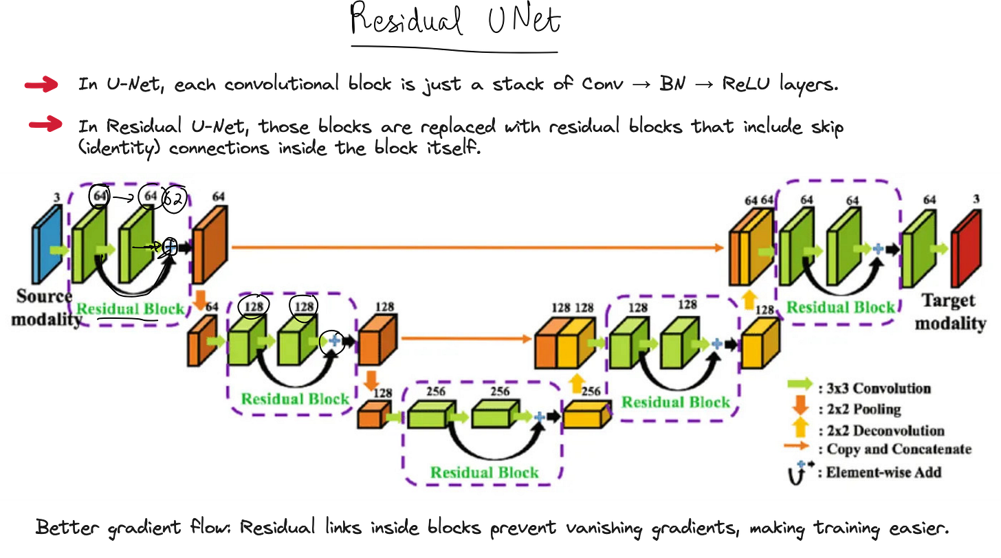 Around the same time, the deep learning community was embracing residual learning thanks to ResNet (2015). Researchers applied the same principle to UNet. The idea was simple: instead of plain convolutional layers, use residual blocks (convolution + skip within the block) in both encoder and decoder.