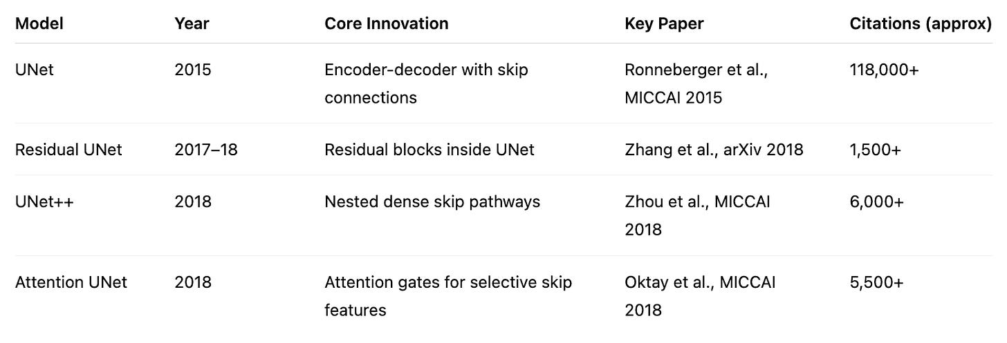 The UNet family shows how a single architectural idea can evolve and adapt to different needs. The original UNet opened the door for efficient segmentation, and its successors added depth, refinement, and intelligence. Depending on the application, one might choose UNet for simplicity, Residual UNet for deeper models, UNet++ for precise boundaries, or Attention UNet for selective feature learning.