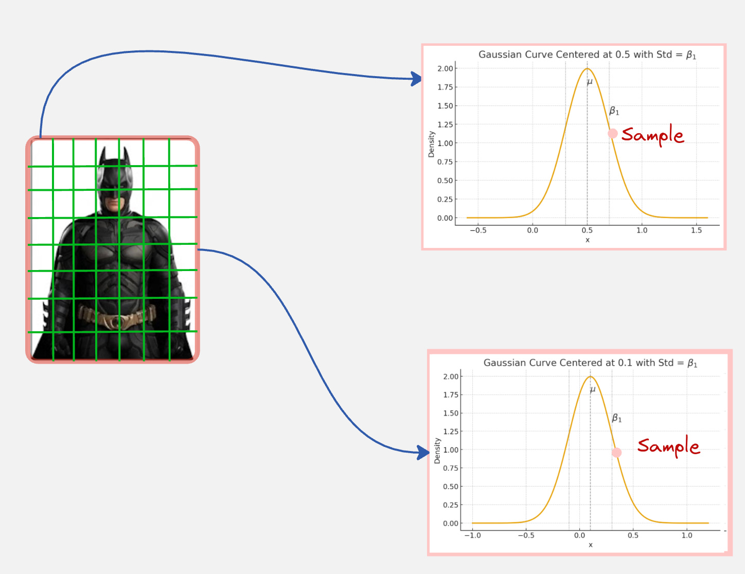 Now, for each pixel, we will sample from a Gaussian with the mean fixed to be the pixel value and a small variance (beta).