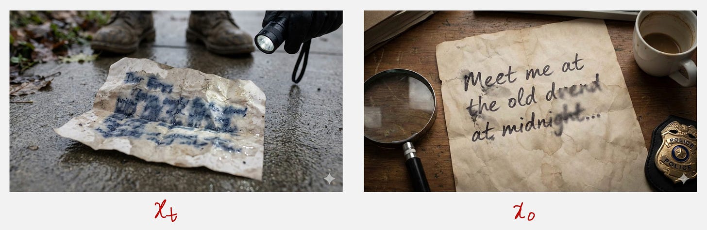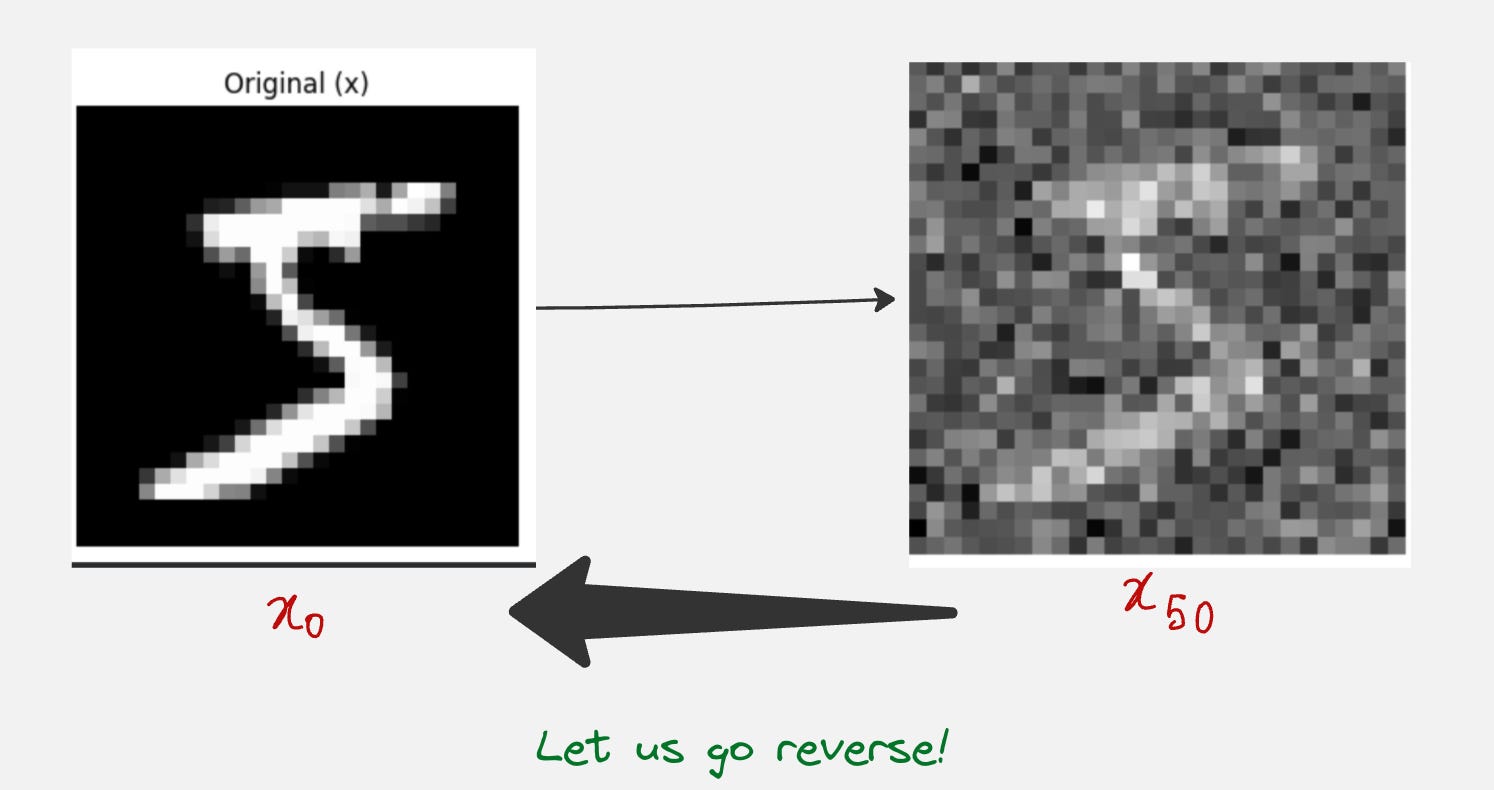 Now, suddenly it becomes much easier to find the image at the previous time step, which is x(t-1). This is because we have access to the original image.