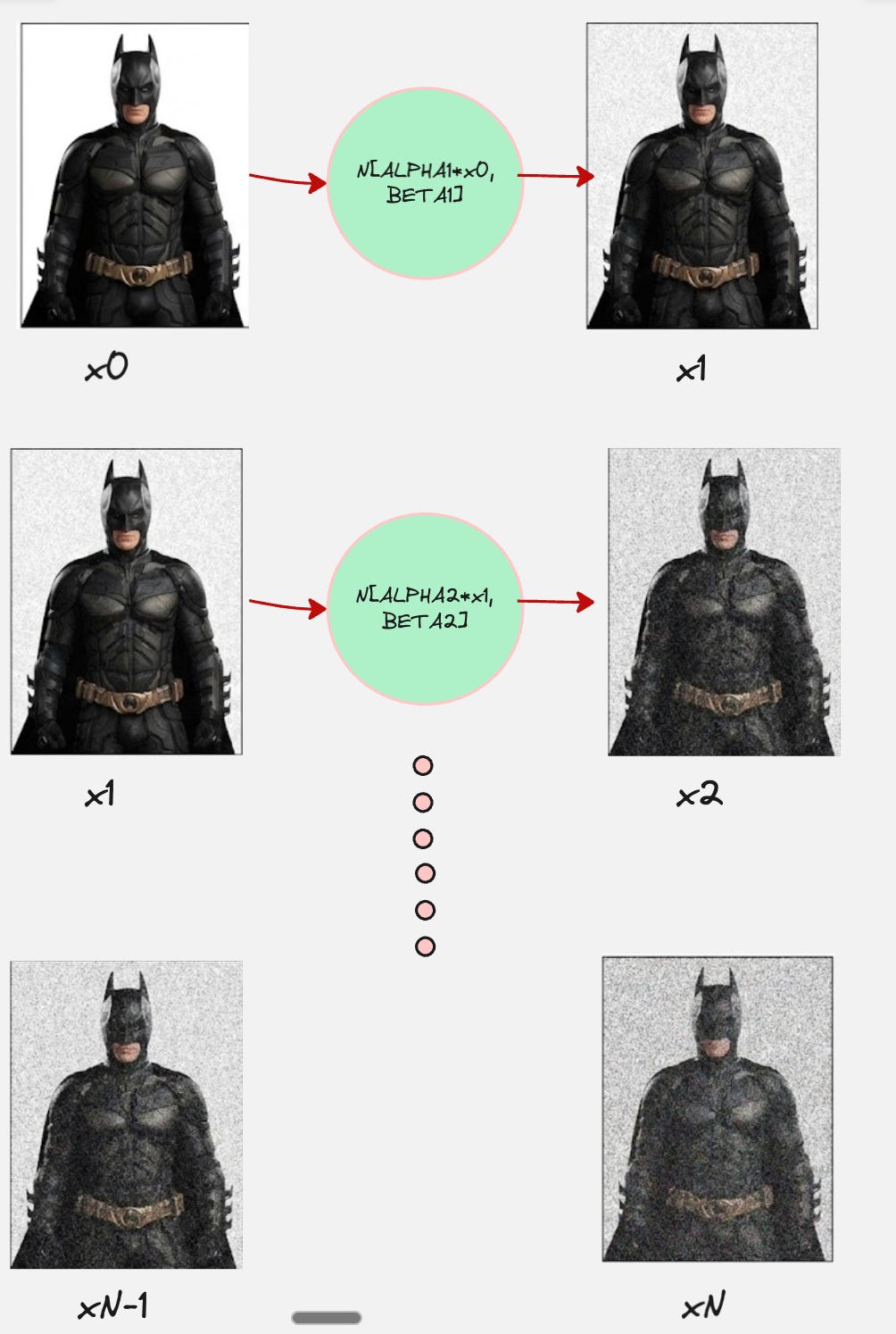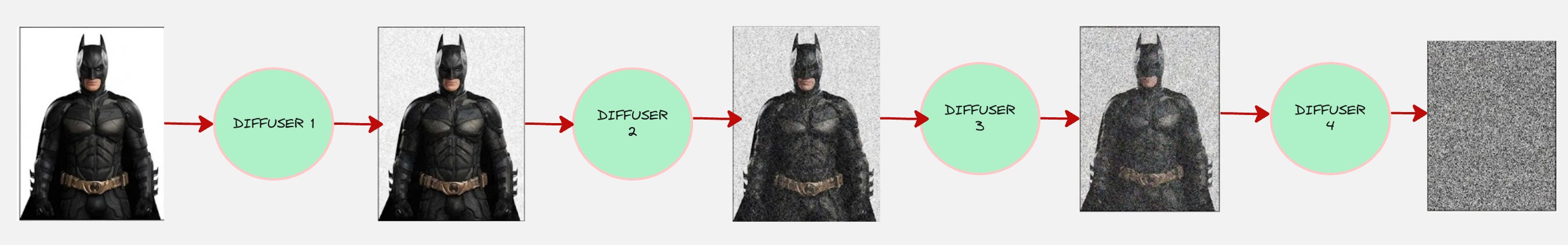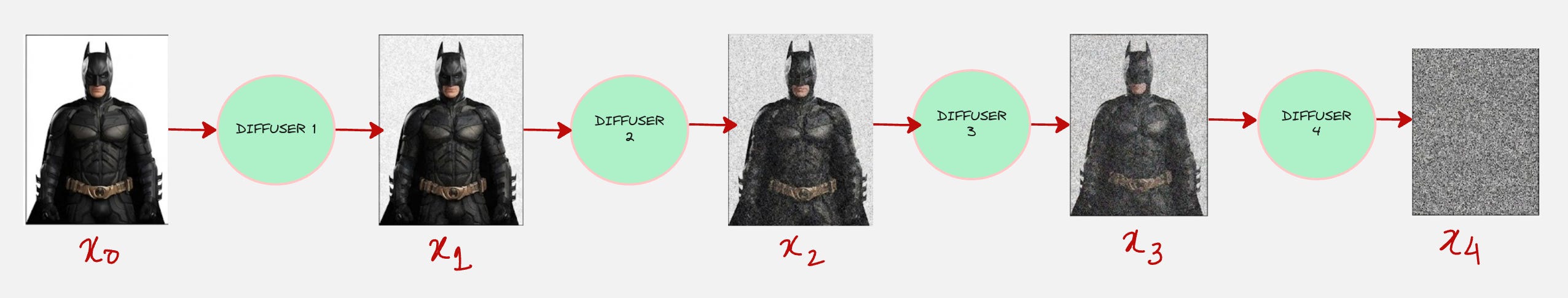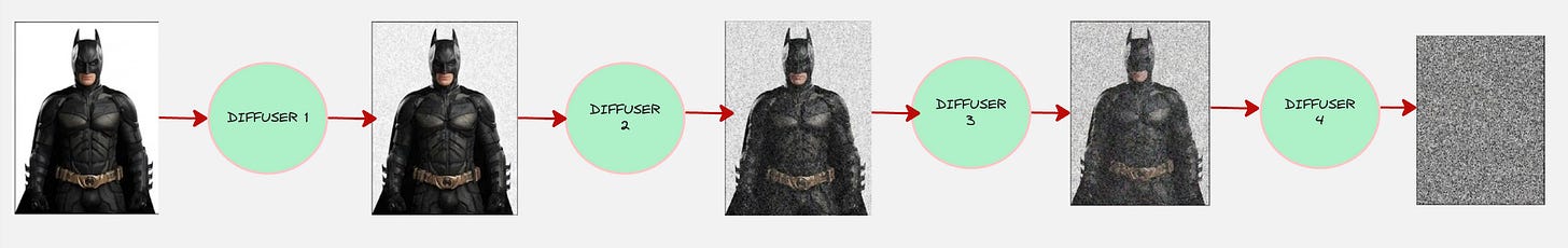 We do this for every transition. So, our forward diffusion process looks as follows: