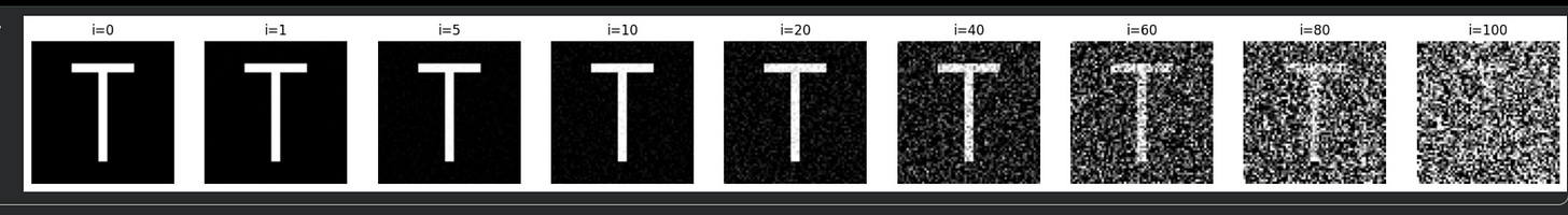 We will transform the letter “T” to noise using the forward diffusion process.