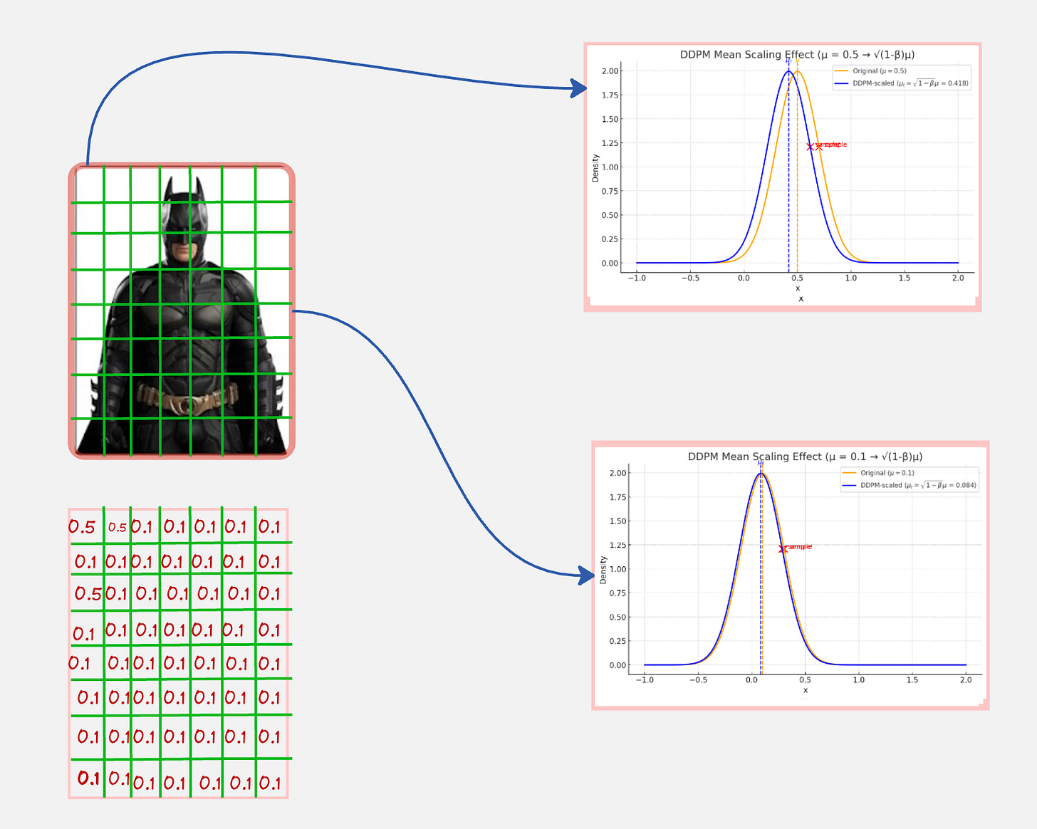 Notice how for the 2 pixels, we are sampling from a distribution with a mean which is scaled down (such that it moves towards zero).