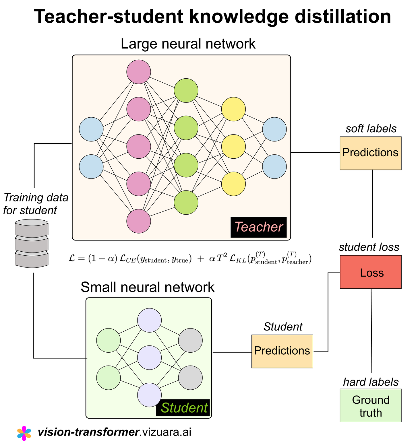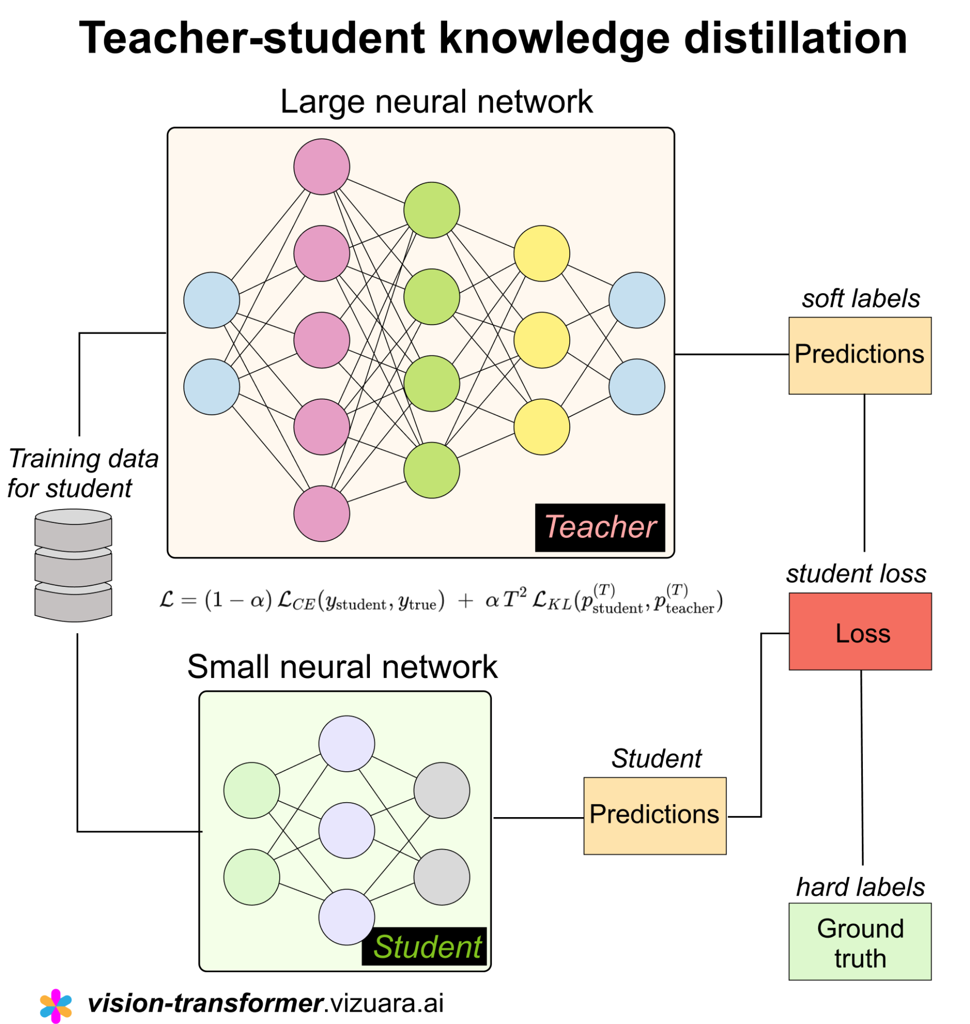 During training, the student is optimized to match these soft outputs, typically using a softened softmax with a temperature parameter, along with or sometimes instead of the original ground truth labels.