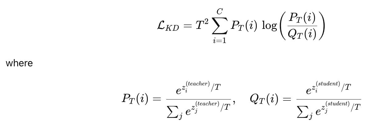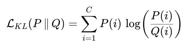 Here, C is the number of classes, P(i) is the probability assigned by the teacher to class i, and Q(i) is the probability assigned by the student to the same class.