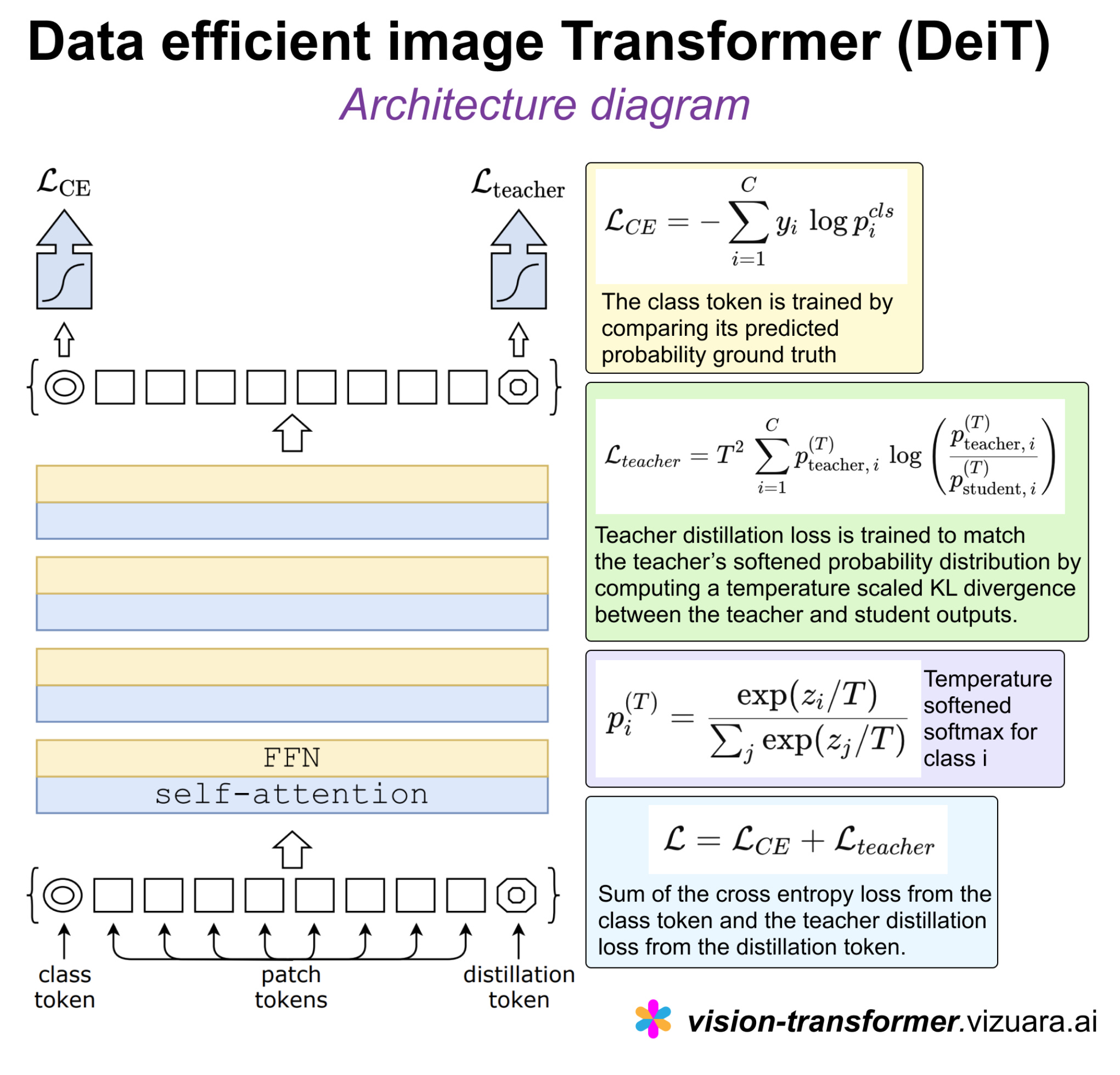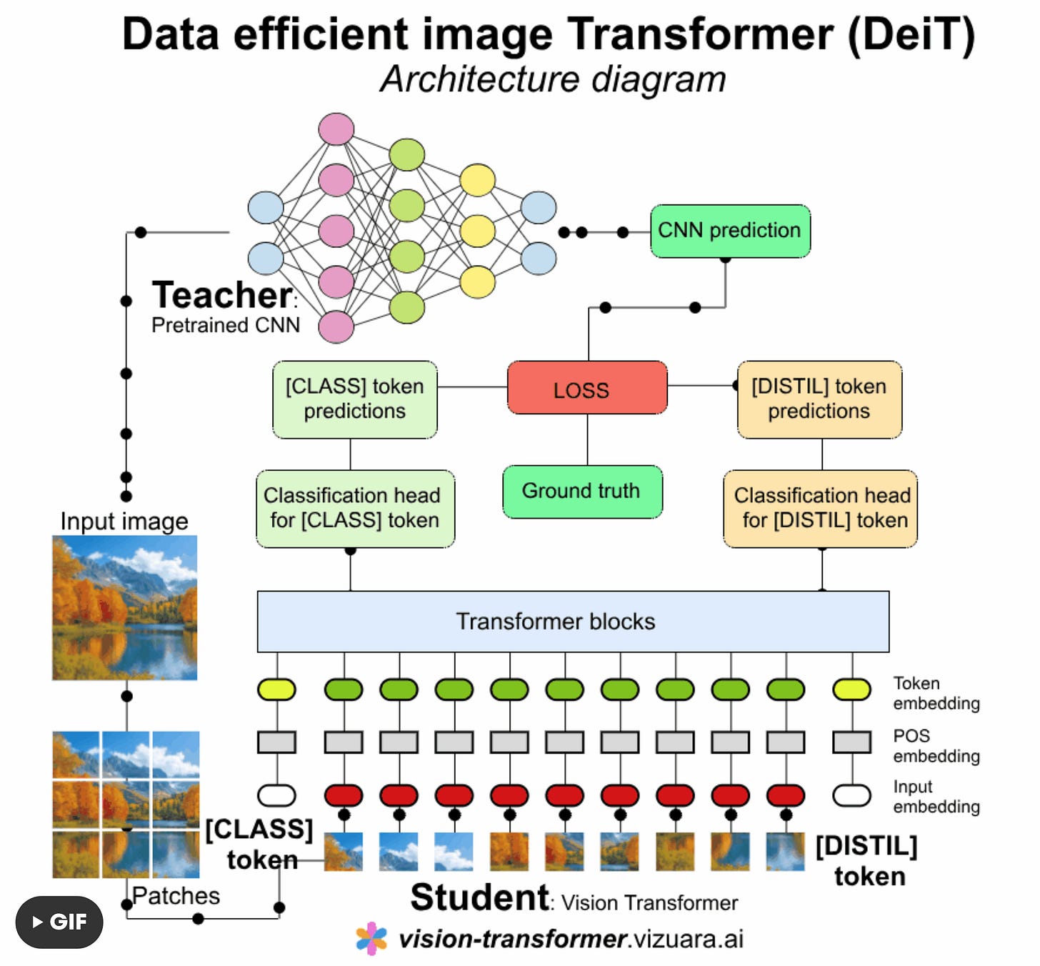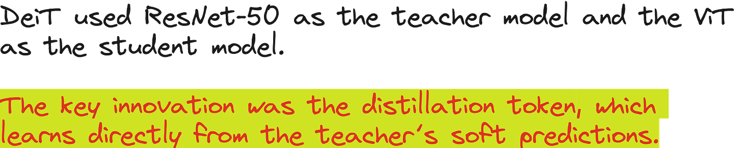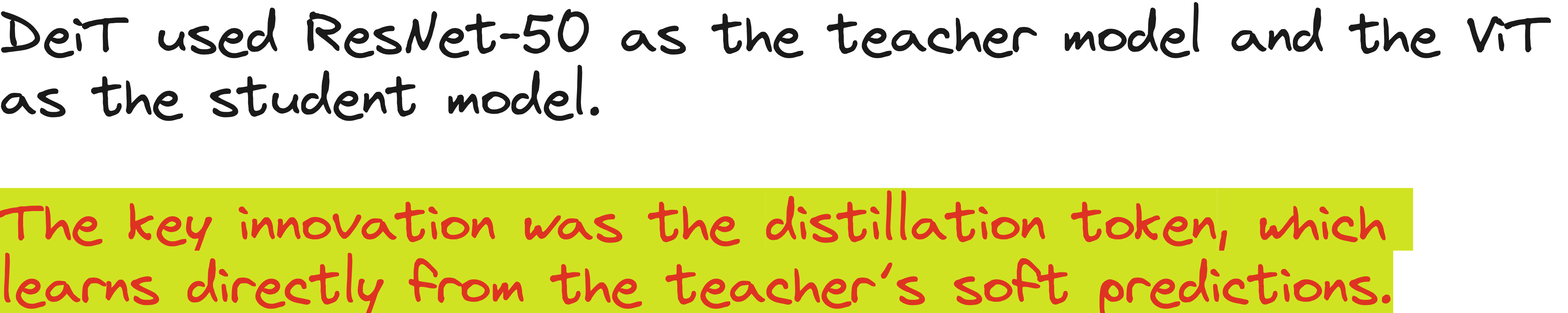The paper “Data-efficient Image Transformers (DeiT)” (ICML 2021) showed that ViTs can be trained from scratch without large datasets by introducing knowledge distillation from a strong CNN teacher.