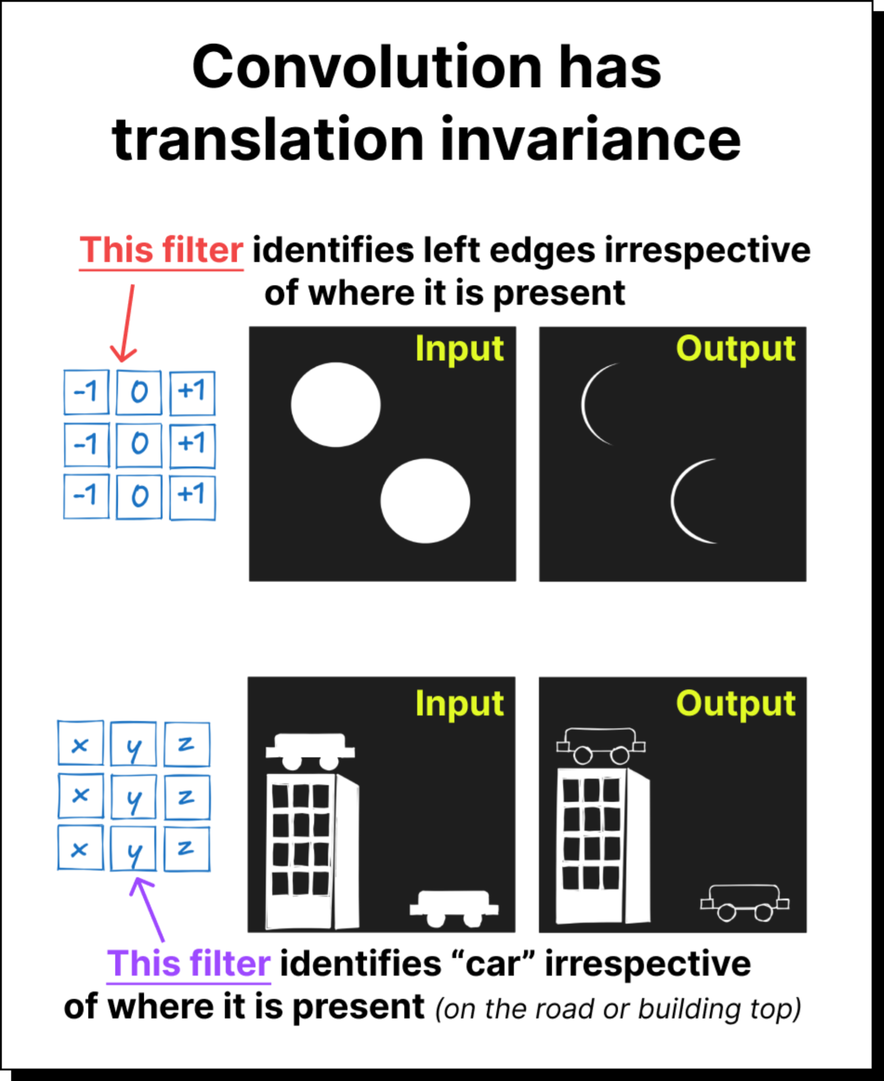Convolution has a property called translation invariance or translation equivariance, as shown in the figure below.