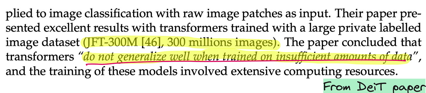 The DeiT paper aimed to make Transformers data-efficient enough to train on standard ImageNet-1k (1.2M images) without pretraining. Please note that the original ViT model was trained on around 300 million images.