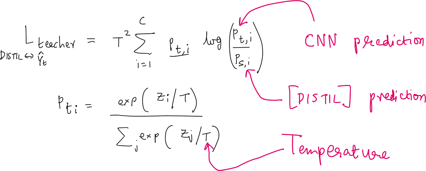 In knowledge distillation, these probabilities usually come from a softmax with temperature T, so the loss is often written as: