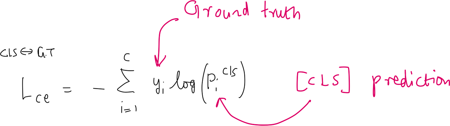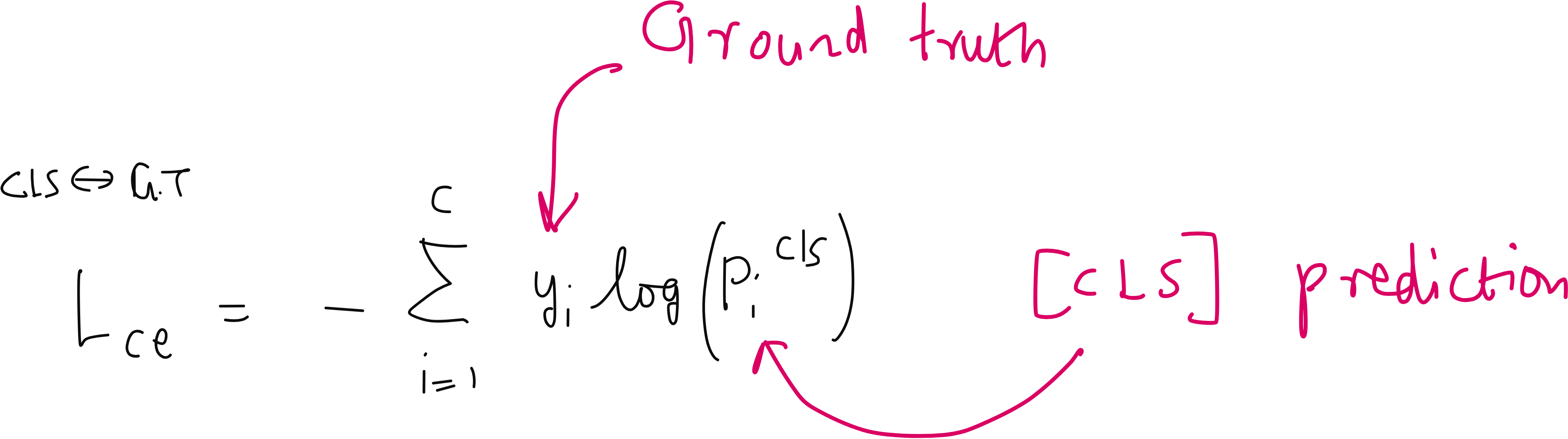 The first loss is a standard cross-entropy loss. This loss is computed between the class token output and the ground truth label. This part is exactly the same as regular supervised training. It ensures that the model learns the actual classification task correctly.