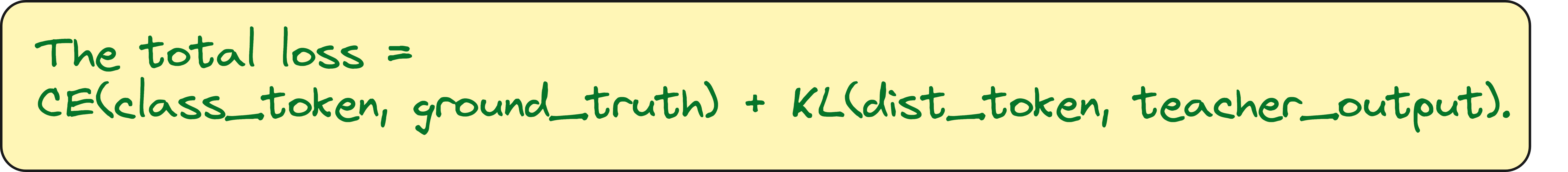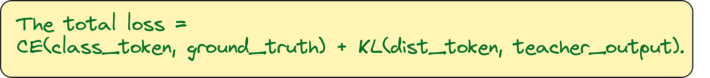 The second loss is also a cross-entropy loss. This time it is computed between the distillation token output and the teacher’s predicted label. In DeiT, the teacher gives a hard label, not a soft probability distribution. Because of this, DeiT uses hard distillation instead of the usual KL-divergence-based soft distillation.