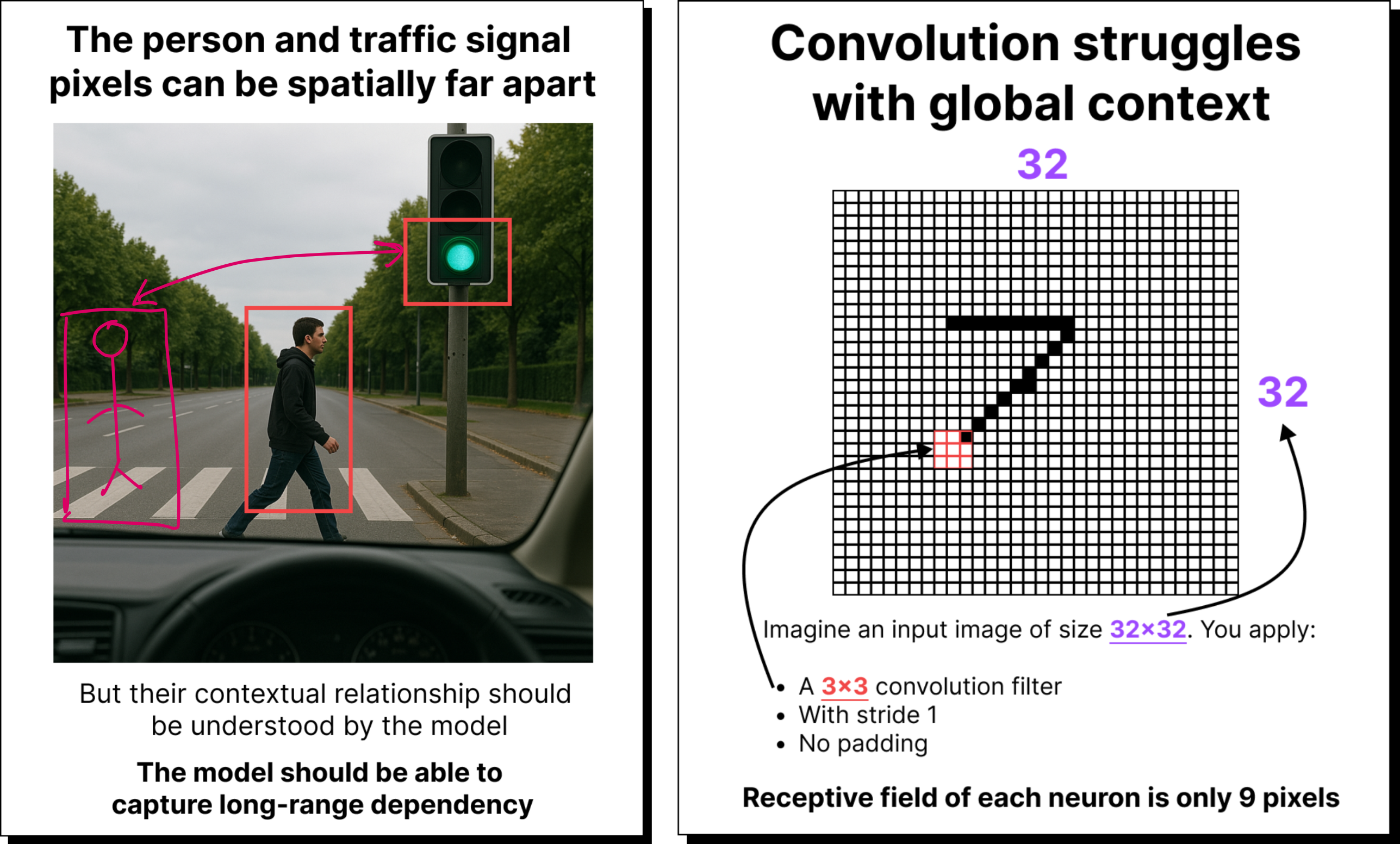 Many image-based applications require long-range dependencies. For example, if there is a person who is crossing a street, a self-driving car should ideally not move forward even if the light is green. It doesn’t matter how far the pixels corresponding to the green light and the pixels corresponding to the person are. So this is something that convolution will struggle to capture.