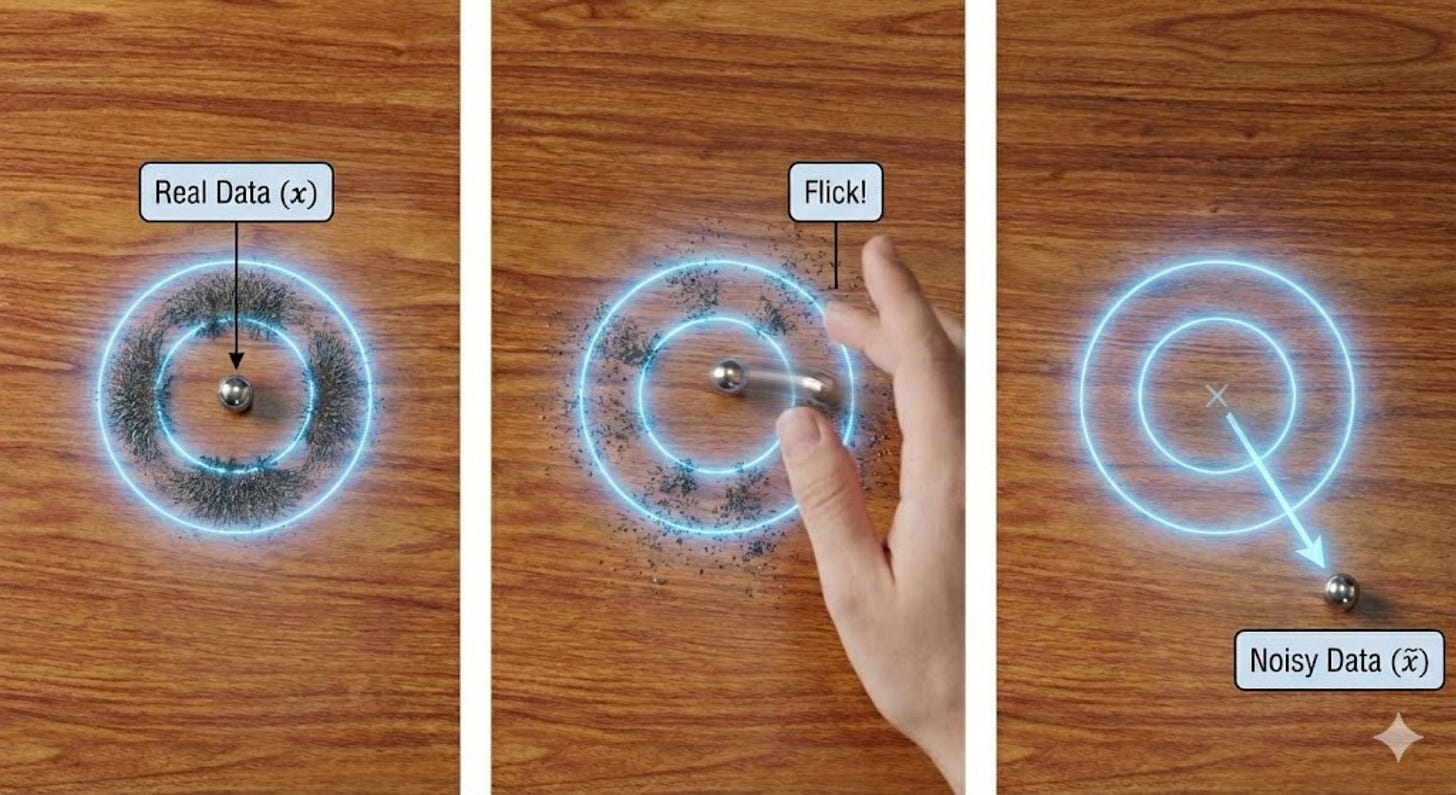 We place a metal ball exactly on top of a hidden magnet. We flick the ball in a random direction. It rolls away and stops at a new, random spot. This is the Noisy Data.