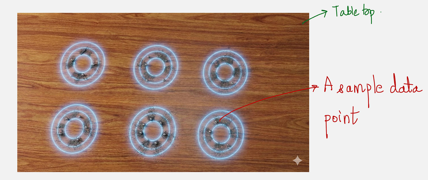 Imagine you have a tabletop. There are invisible magnets hidden at specific spots on this table. These magnets represent your Real Data.