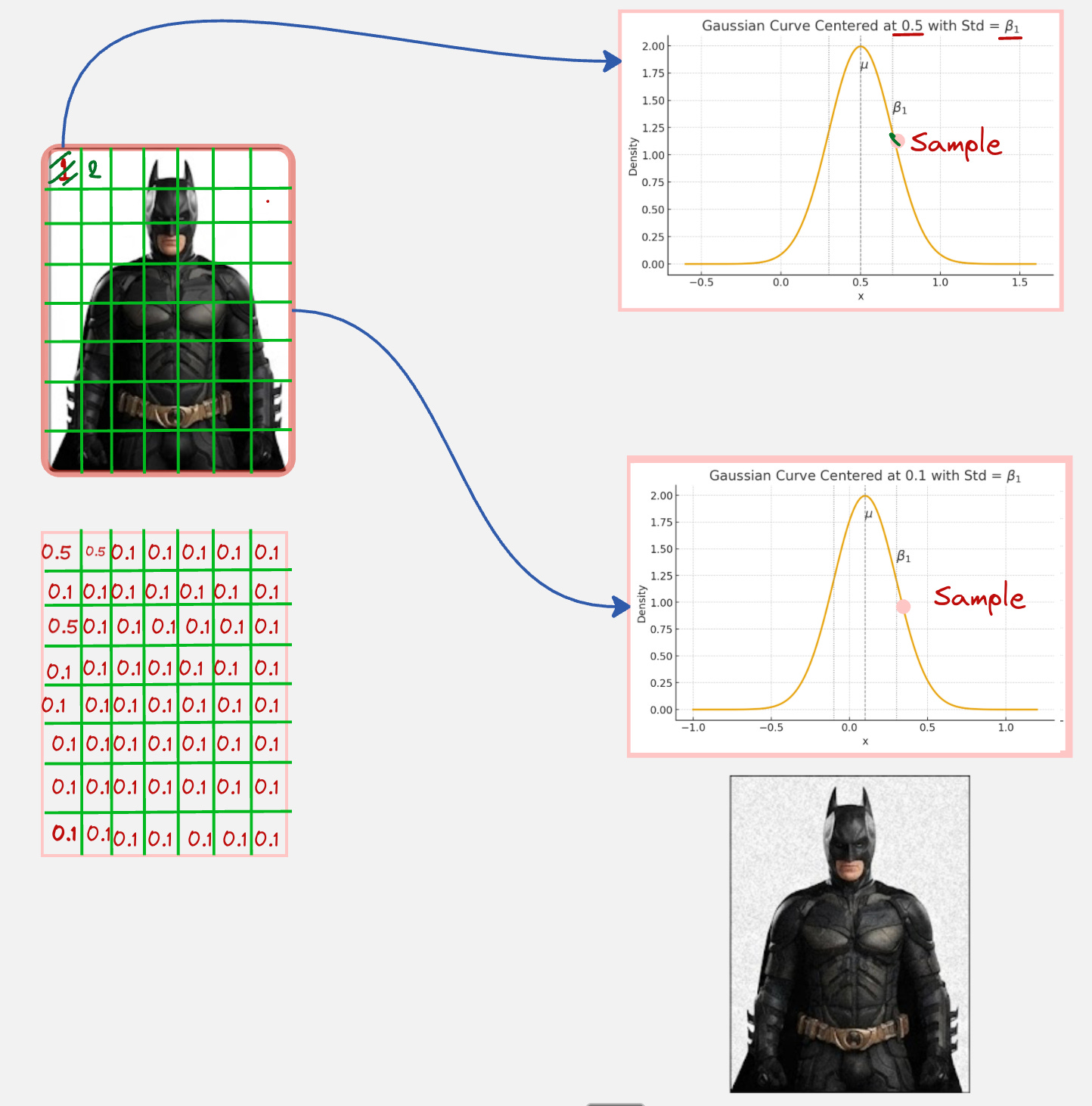 In this image, what we have done is we have taken a pixel from the Batman image and then added noise to that pixel. The addition of noise is done by sampling using a Gaussian distribution with the same mean as the pixel value and the standard deviation as the noise level.
