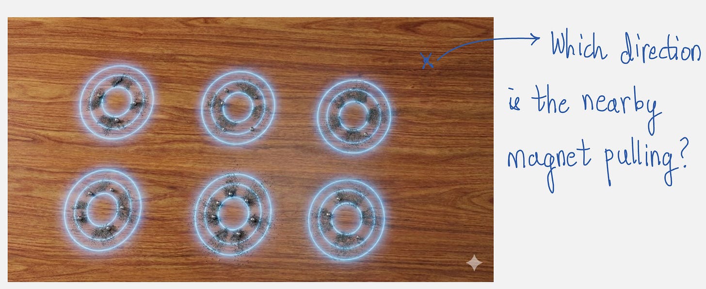 Your goal is to draw a map of the magnetic field that tells you, for any point on the table, which direction the nearest magnet is pulling.