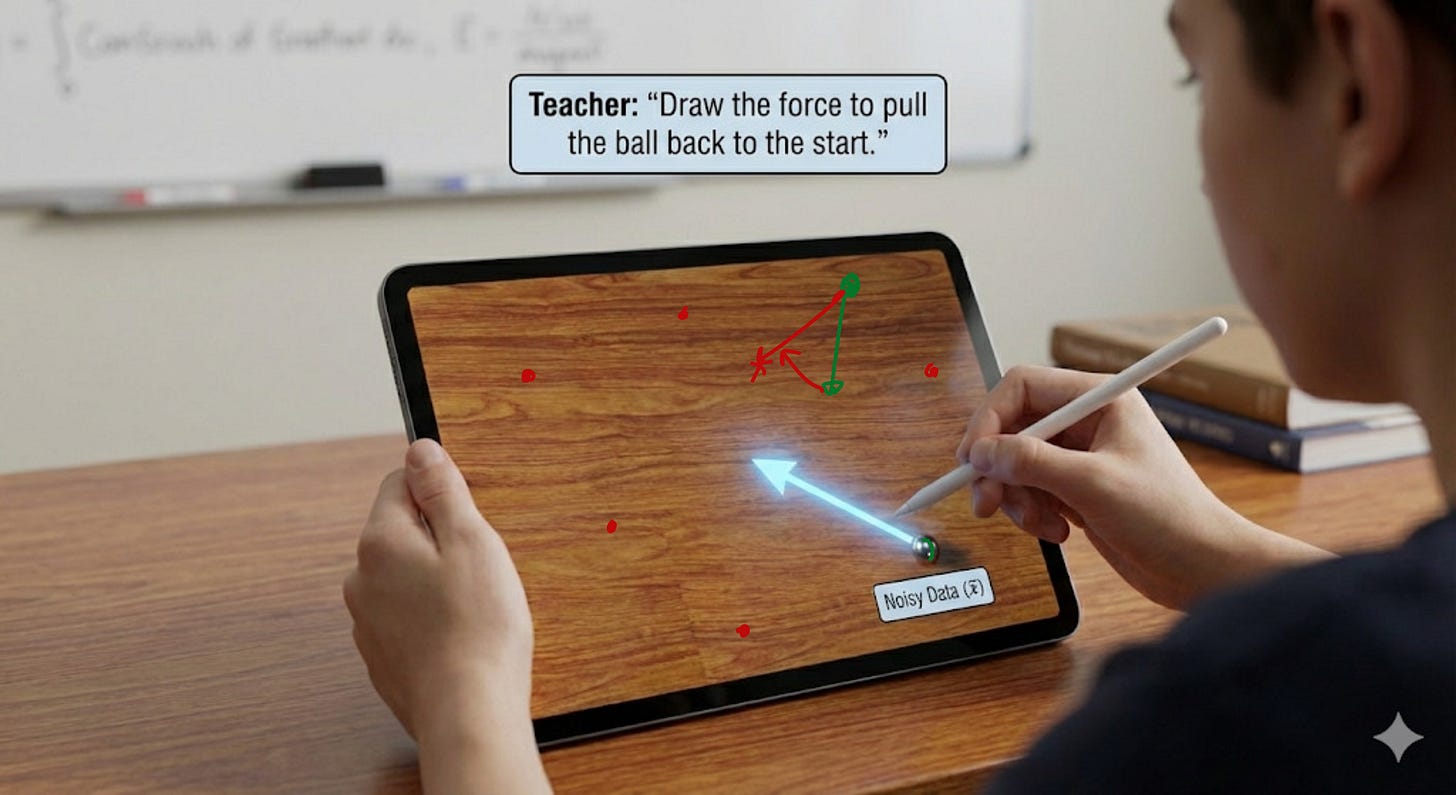 So if we can give the student feedback based on the student’s prediction and our knowledge, we can teach the student how to draw the force to pull the ball back to the starting point for every possible noisy data in the field.